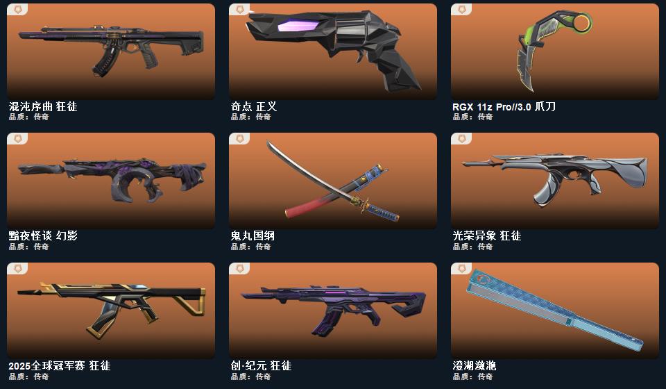 wegame无畏契约★武器皮肤数量:47,2022全球冠军赛 蝴蝶刀,5周年//公测重制版 苍龙之刃,日耀风暴 遗器,鬼丸国纲,RGX 11z Pro//3.0 爪刀,澄湖潋滟,星际猎兵 标配,2025全球冠军赛 狂徒,归零者//2.0 莽侠,日耀风暴 奥丁