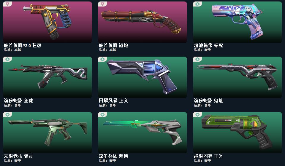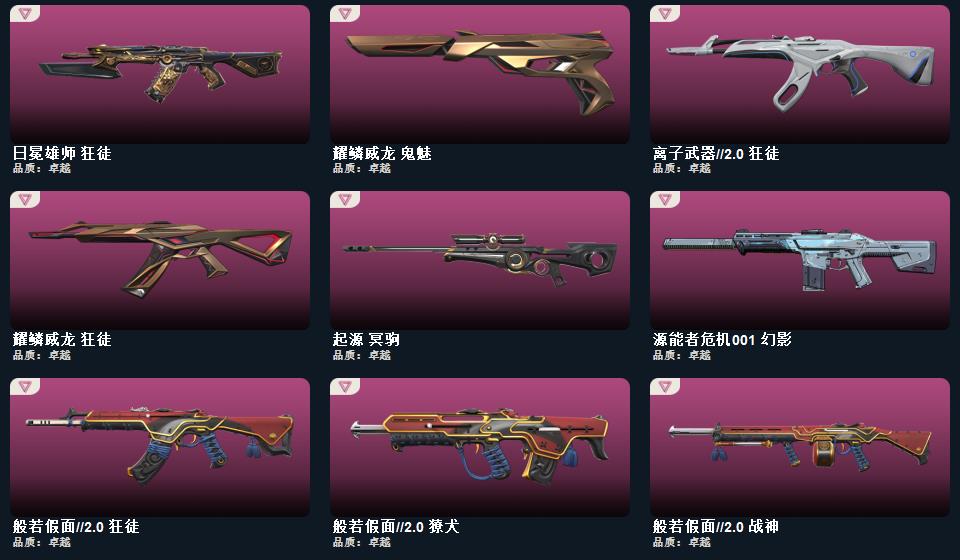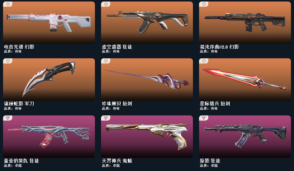 wegame无畏契约★武器皮肤数量:82,般若假面 短炮,甜心猎手 短炮,诛心猎手 正义,光环序列 狂怒,瑰梦艺语 鬼魅,星际猎兵 标配,阿特拉斯指挥部 标配,日耀风暴 正义,诡秘蛇影 鬼魅,折光棱晶 标配,末日之翼 短炮,星云暗涌 鬼魅,西部未来 正义,纳米打击 正义,般若假面//2.0 狂怒,超限闪存 正义,超能偶像 标配,流星兵团 鬼魅,复古浪潮 正义,天界神兵 鬼魅,珍珠棘贝 狂怒,深海水族 短炮,光导纤维 鬼魅,耀鳞威龙 鬼魅