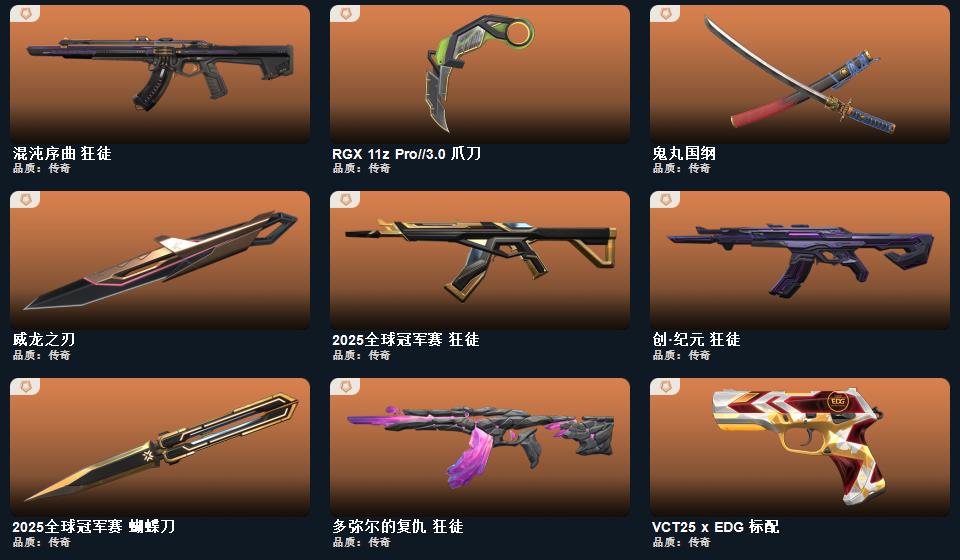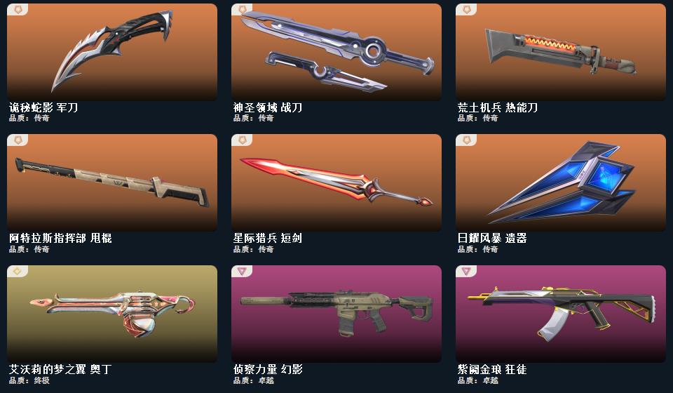 wegame无畏契约★武器皮肤数量:103,甜心猎手 短炮,星际猎兵 标配,瑰梦艺语 鬼魅,光环序列 狂怒,阿特拉斯指挥部 标配,太空穿梭 正义,悠闲猫生 短炮,幻语魔咒 狂怒,甜蜜战术 鬼魅,日耀风暴 正义,诡秘蛇影 鬼魅,扑棱扑棱 鬼魅,折光棱晶 标配,末日之翼 短炮,神圣领域 狂怒,月球哨兵 正义,星云暗涌 鬼魅,VCT25 x EDG 标配,荒土机兵 标配,逆冲蛮牛 狂怒,纳米打击 正义,般若假面//2.0 狂怒