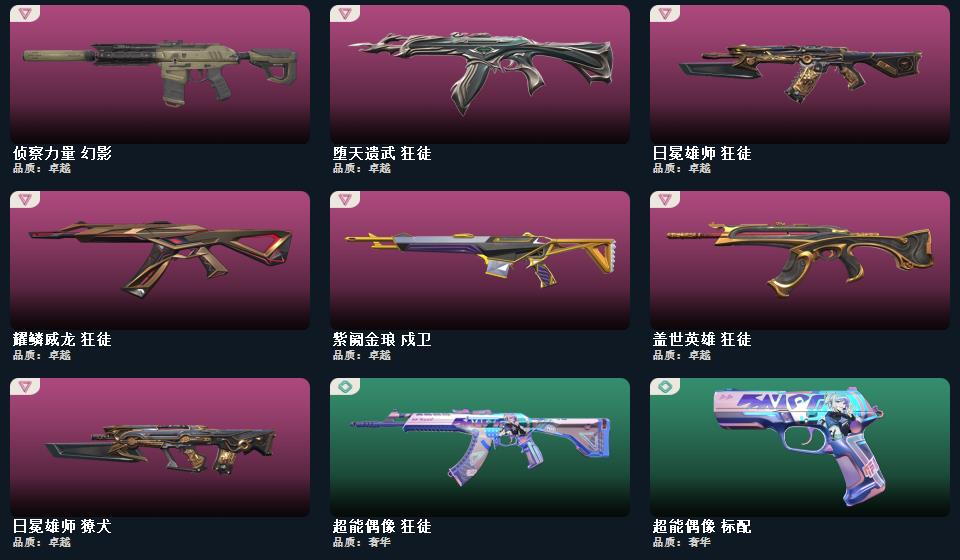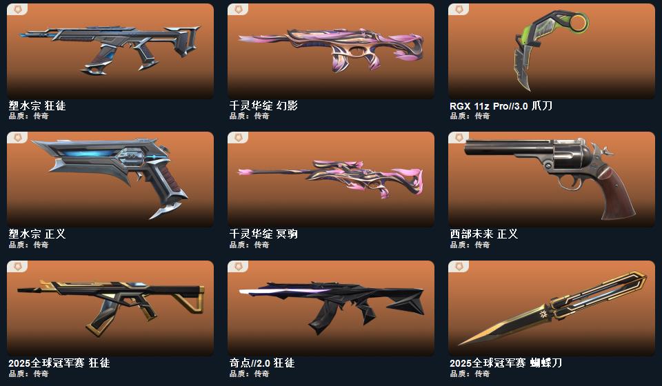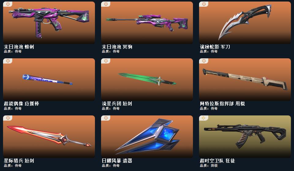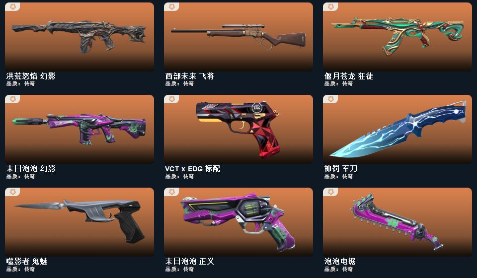 wegame无畏契约★武器皮肤数量:115,诛心猎手 正义,甜心猎手 短炮,星际猎兵 标配,末日泡泡 正义,瑰梦艺语 鬼魅,光环序列 狂怒,阿特拉斯指挥部 标配,太空穿梭 正义,悠闲猫生 短炮,日耀风暴 正义,幻语魔咒 狂怒,甜蜜战术 鬼魅,西部未来 正义,诡秘蛇影 鬼魅,折光棱晶 标配,末日之翼 短炮,噬影者 鬼魅,星云暗涌 鬼魅,VCT x EDG 标配,超能偶像 标配,聚合之力 狂怒,采蜜小蜂队 鬼魅,塑水宗 正义,流星兵团 鬼魅,战术熊与伙伴们 标配,纤云弄巧 短炮,战术熊与伙伴们 狂怒,纤云弄巧 正义,魄月玄兔 鬼魅