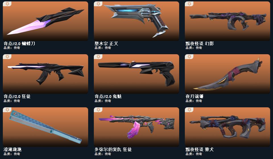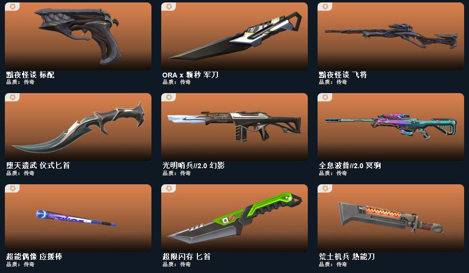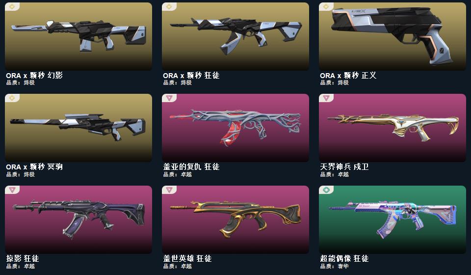 wegame无畏契约★ORA x 颗秒 正义,诛心猎手 正义,甜心猎手 短炮,末日之翼 短炮,折光棱晶 标配,纳米打击 正义,逆冲蛮牛 狂怒,荒土机兵 标配,奇点//2.0 鬼魅,超限闪存 正义,塑水宗 正义,浮光跃金 标配,模拟赫兹 鬼魅,黯夜怪谈 标配,聚合之力 狂怒,采蜜小蜂队 鬼魅,超能偶像 标配