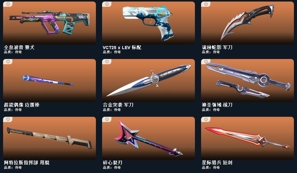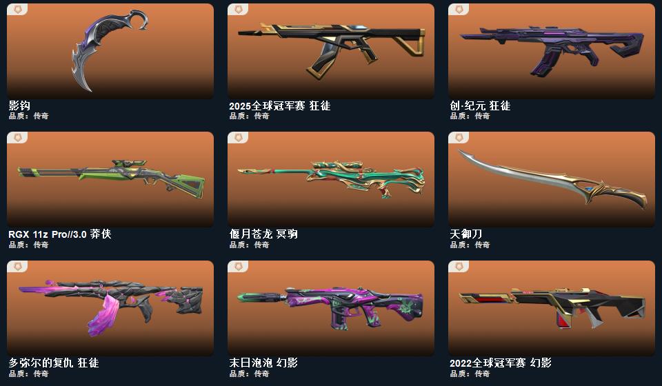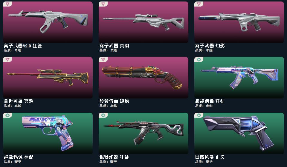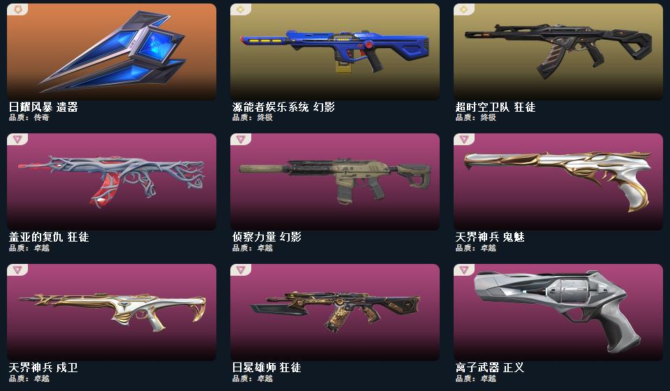 wegame无畏契约★幻心猎手 鬼魅,诛心猎手 正义,甜心猎手 短炮,般若假面 短炮,星际猎兵 标配,瑰梦艺语 鬼魅,光环序列 狂怒,千灵华绽 正义,阿特拉斯指挥部 标配,太空穿梭 正义,悠闲猫生 短炮,日耀风暴 正义,甜蜜战术 鬼魅,西部未来 正义,幻语魔咒 狂怒,诡秘蛇影 鬼魅,折光棱晶 标配,末日之翼 短炮,