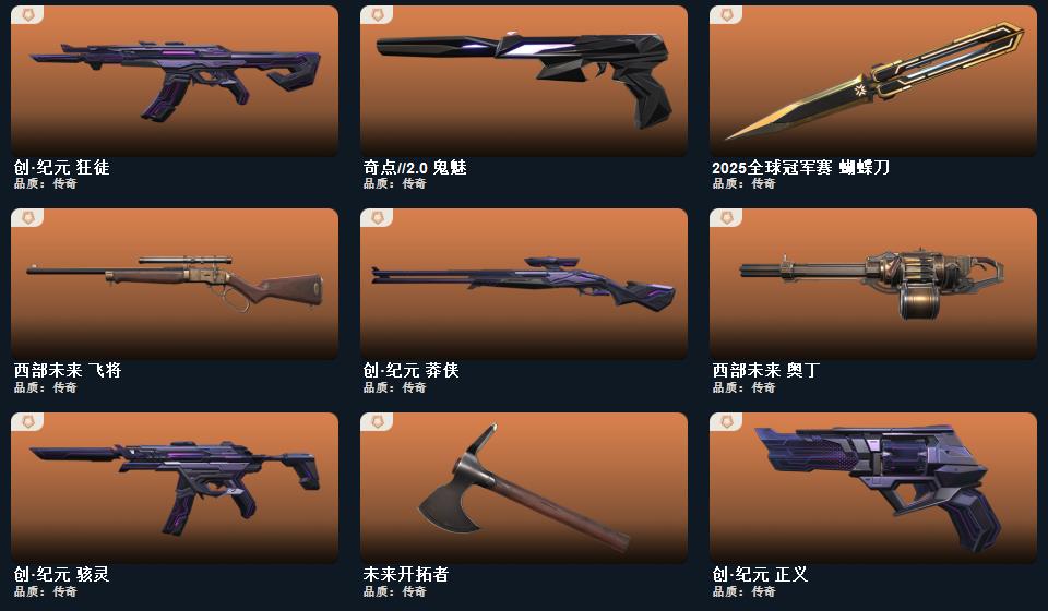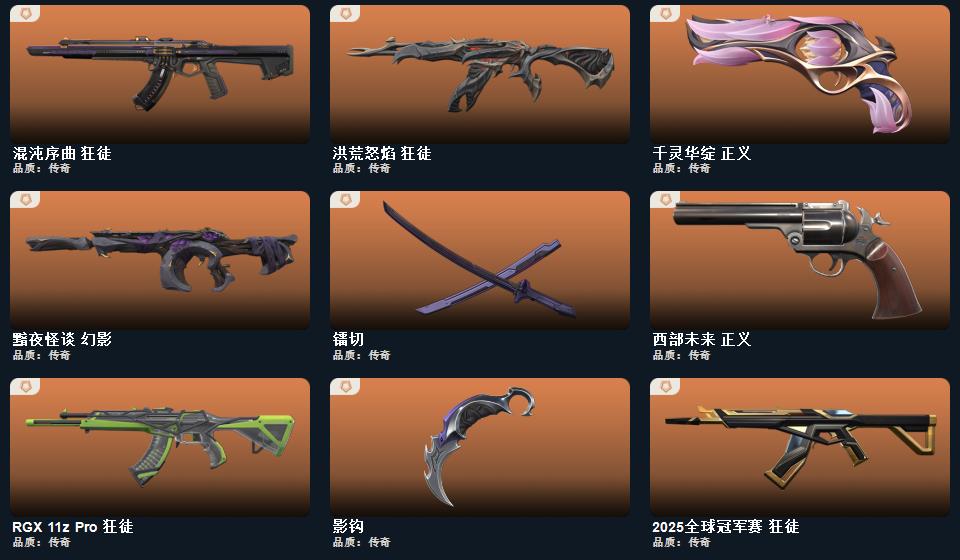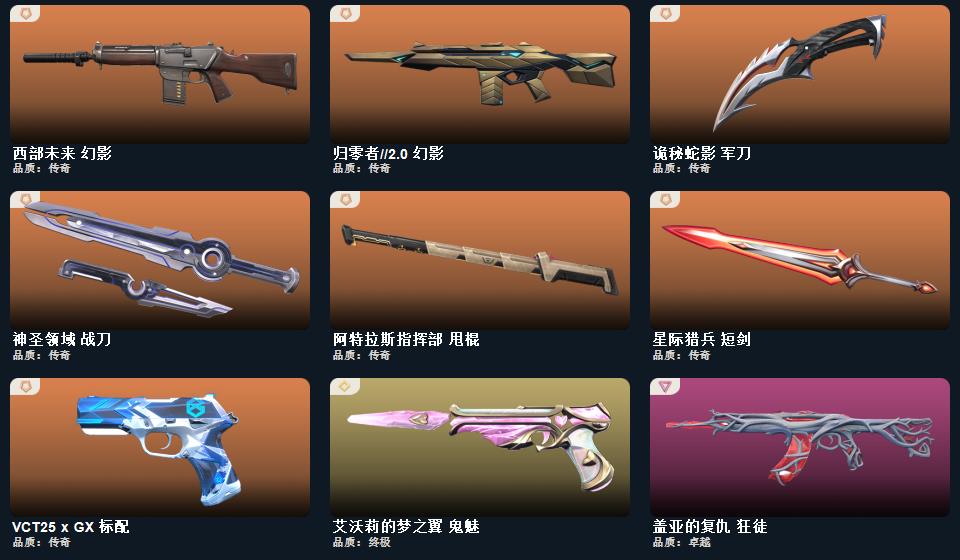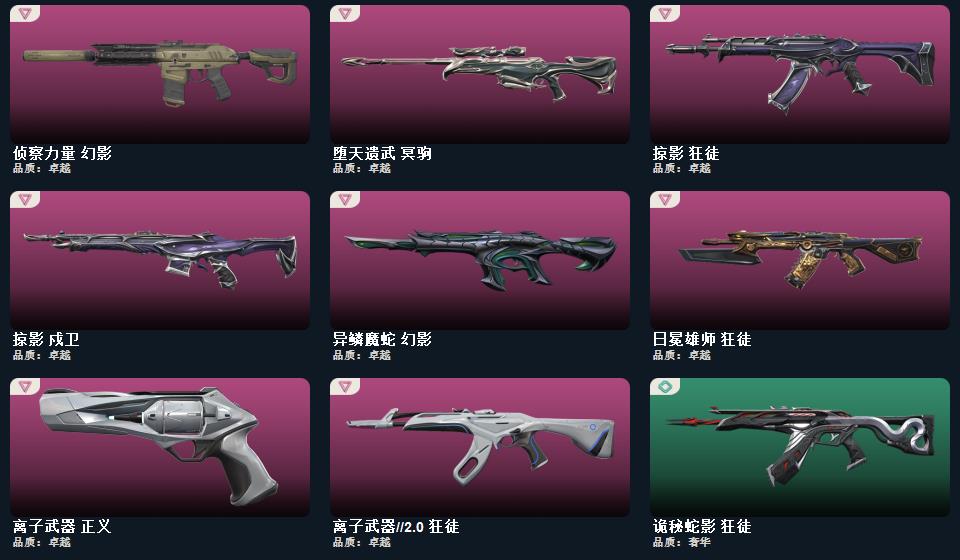 wegame无畏契约★武器皮肤数量:102,诛心猎手 正义,甜心猎手 短炮,星际猎兵 标配,奇点//2.0 鬼魅,离子武器 正义,瑰梦艺语 鬼魅,光环序列 狂怒,阿特拉斯指挥部 标配,悠闲猫生 短炮,太空穿梭 正义,甜蜜战术 鬼魅,幻语魔咒 狂怒,诡秘蛇影 鬼魅,艾沃莉的梦之翼 鬼魅,末日之翼 短炮,折光棱晶 标配,星云暗涌 鬼魅,VCT25 x GX 标配,西部未来 正义,创·纪元 正义,神圣领域 狂怒,月球哨兵 正义,千灵华绽 正义