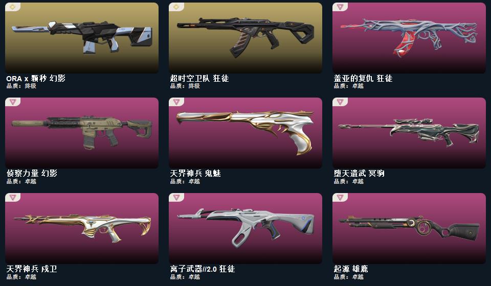 wegame无畏契约★幻心猎手 鬼魅,甜心猎手 短炮,诛心猎手 正义,天界神兵 鬼魅,VCT25 x BOOM 标配,全息波普 狂怒,星际猎兵 标配,光环序列 狂怒,瑰梦艺语 鬼魅,阿特拉斯指挥部 标配,太空穿梭 正义,悠闲猫生 短炮,日耀风暴 正义,甜蜜战术 鬼魅,幻语魔咒 狂怒,诡秘蛇影 鬼魅,折光棱晶