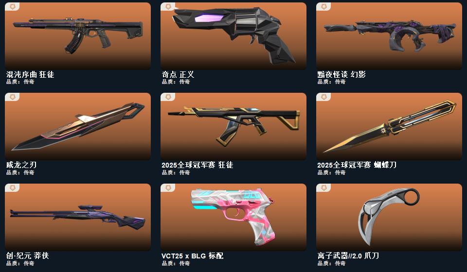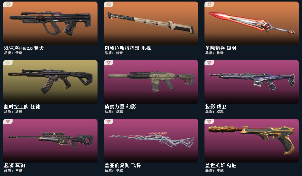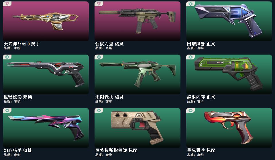 幻心猎手 鬼魅,光环序列 狂怒,瑰梦艺语 鬼魅,星际猎兵 标配,盖世英雄 鬼魅,VCT25 x BLG 标配,悠闲猫生 短炮,太空穿梭 正义,阿特拉斯指挥部 标配,日耀风暴 正义,艺高胆大 标配,诡秘蛇影 鬼魅,奇点 正义,星云暗涌 鬼魅,纳米打击 正义,超限闪存 正义