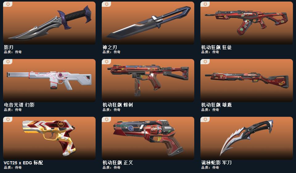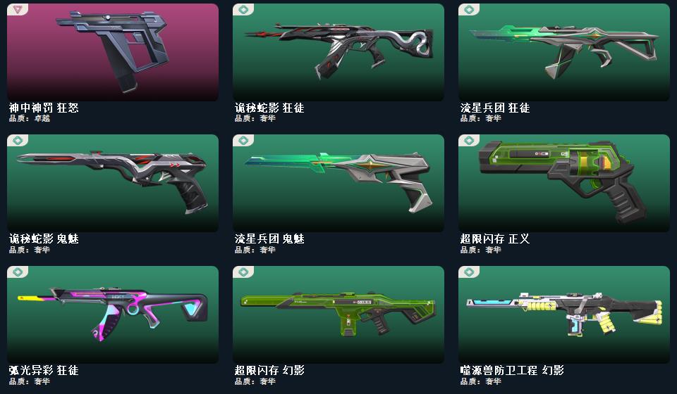 wegame无畏契约★武器皮肤数量:82,幻语魔咒 狂怒,诡秘蛇影 鬼魅,神中神罚 狂怒,VCT25 x EDG 标配,折光棱晶 标配,末日之翼 短炮,超限闪存 正义,掠影 正义,浮光跃金 标配,模拟赫兹 鬼魅,奇点//2.0 鬼魅,奇点 正义,流星兵团 鬼魅,纤云弄巧 正义,好搭档 短炮,战术熊与伙伴们 标配,纤云弄巧 短炮,战术熊与伙伴们 狂怒,光导纤维 鬼魅,沙尘幻旅 正义,沙场老兵 鬼魅,机动狂飙 正义,彩梦之城 标配,信手涂鸦 鬼魅