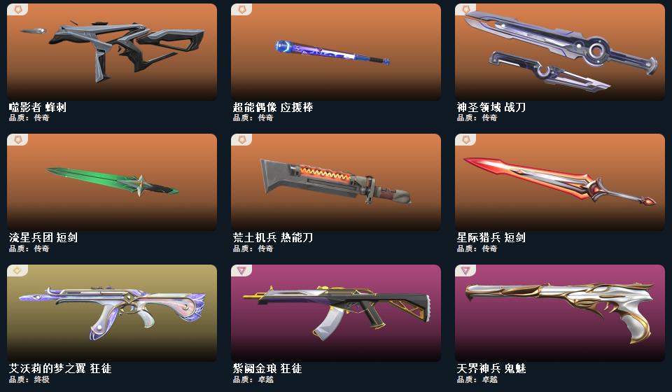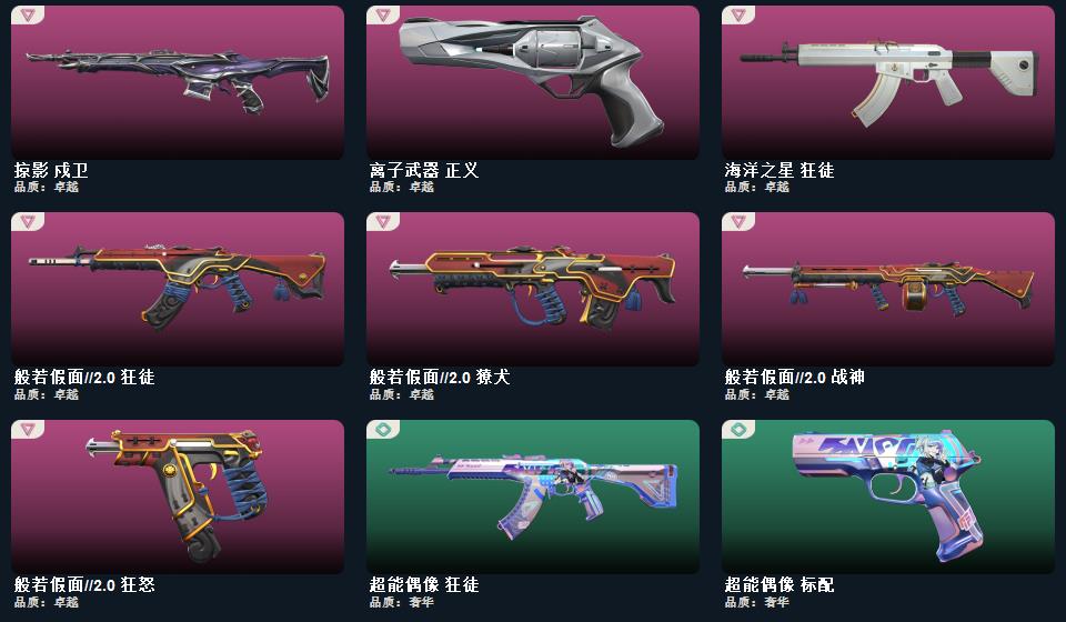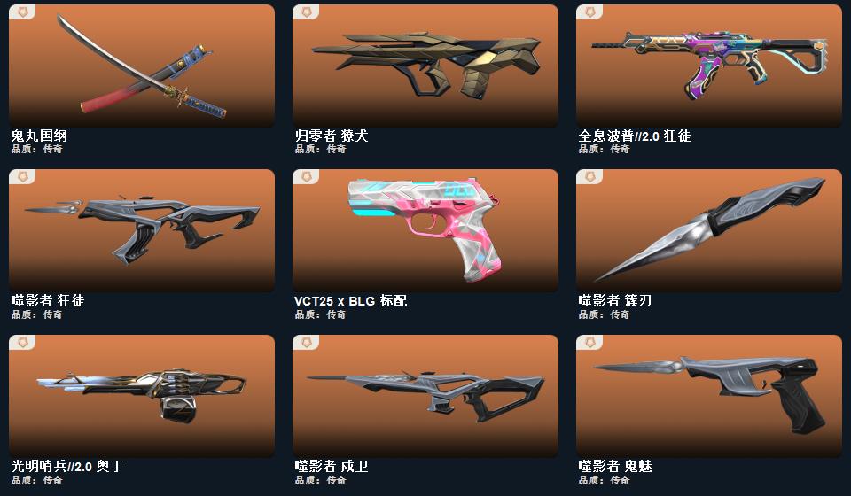 幻心猎手 鬼魅,星际猎兵 标配,光环序列 狂怒,瑰梦艺语 鬼魅,折光棱晶 标配,末日之翼 短炮,噬影者 鬼魅,神圣领域 狂怒,月球哨兵 正义,离子武器 正义,星云暗涌 鬼魅,VCT25 x BLG 标配,荒土机兵 标配,逆冲蛮牛 狂怒,纳米打击 正义,般若假面//2.0 狂怒,超能偶像 标配,聚合之力 狂怒,采蜜小蜂队