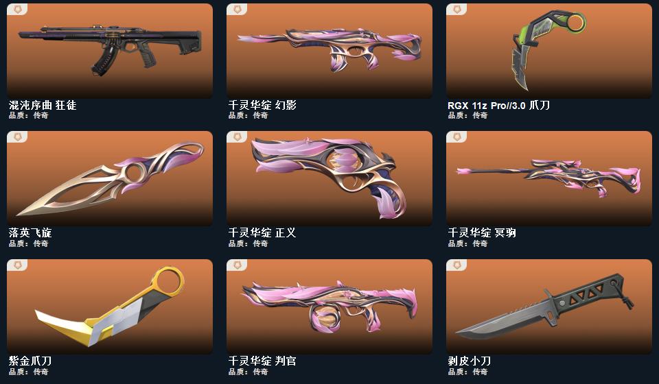wegame无畏契约★武器皮肤数量:103,幻心猎手 鬼魅,星际猎兵 标配,光环序列 狂怒,瑰梦艺语 鬼魅,折光棱晶 标配,末日之翼 短炮,噬影者 鬼魅,神圣领域 狂怒,月球哨兵 正义,离子武器 正义,星云暗涌 鬼魅,VCT25 x BLG 标配,荒土机兵 标配,逆冲蛮牛 狂怒,纳米打击 正义,般若假面//2.0 狂怒,超能偶像 标配,聚合之力 狂怒,采蜜小蜂队