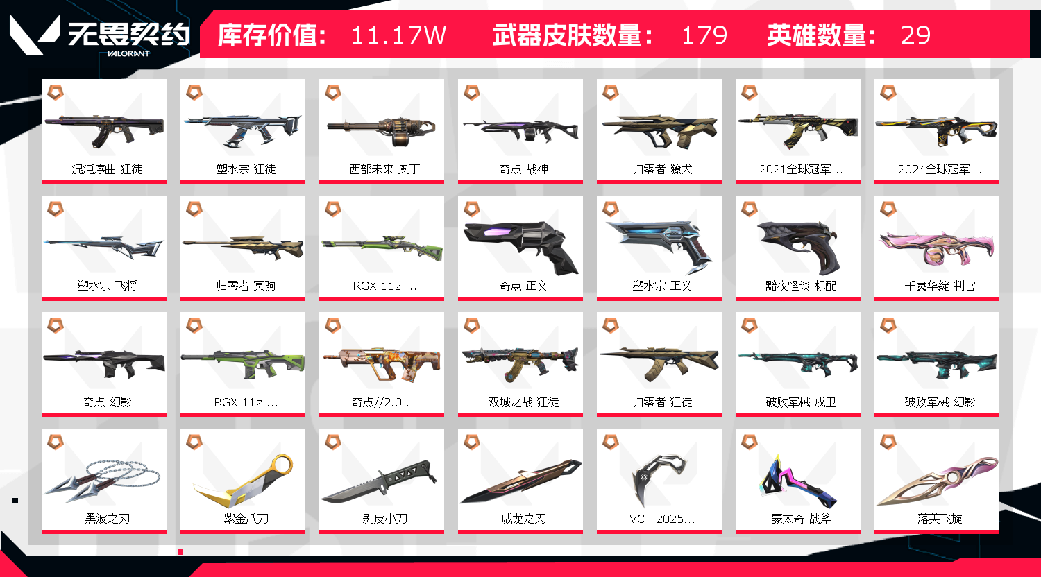 秒解冻21冠军24冠军;西部未来 奥丁,奇点 战神,黑波之刃,紫金爪刀,剥皮小刀,威龙之刃,VCT 2025 爪刀,