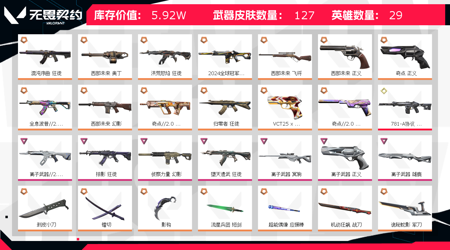 可排位 英雄28 武器皮肤数量126 炸鱼拉黑;西部未来 奥丁,剥皮小刀,镭切,洪荒怒焰 狂徒,掠影 狂徒,侦察力量 幻影,堕天遗武 狂徒,