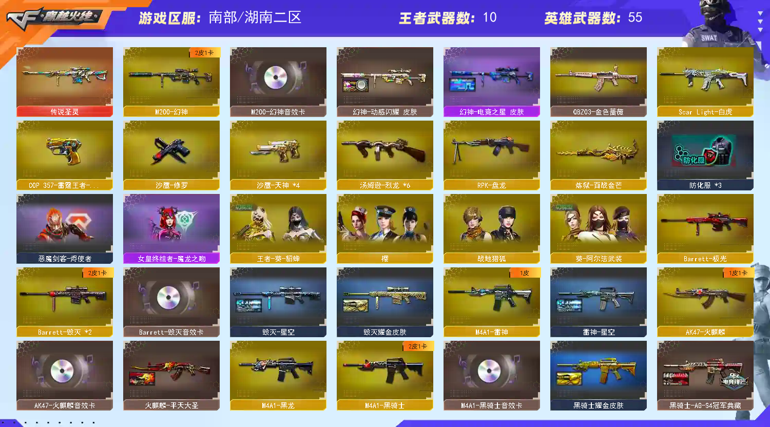 【m200幻神+音效卡】【6烈龙 盘龙】【传说圣灵】【scar白虎】【qbz金色蔷薇】【火麒麟+卡】【黑龙】【雷神】【黑骑士+卡+s4冠军】【毁灭+卡】【极光】 【武器:无影 武圣 王者之心 天龙】 【6手呛:修罗 沙鹰天神*4 cop雷霆王者】 【7刀具:屠龙*2 龙啸 擎天 麒麟刺*2 尼泊尔雷霆】 【雷套:雷霆雷】 【小人呛:】 【音效卡:火麒麟音效卡 幻神音效卡 黑骑士音效卡 毁灭音效卡 】 【四防角色:王者葵貂蝉 职业经理】;RPK-盘龙,QBZ03-金色蔷薇,M200-幻神,Scar Light-白虎,