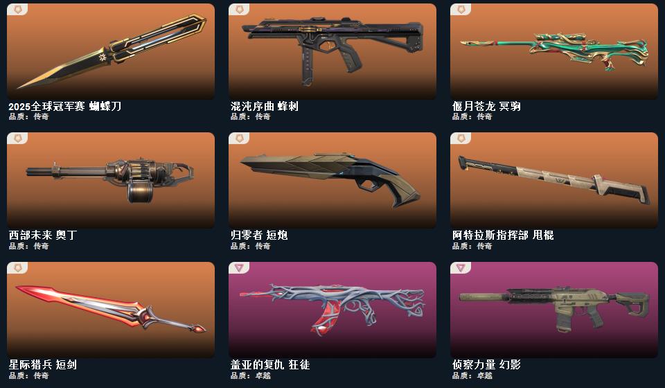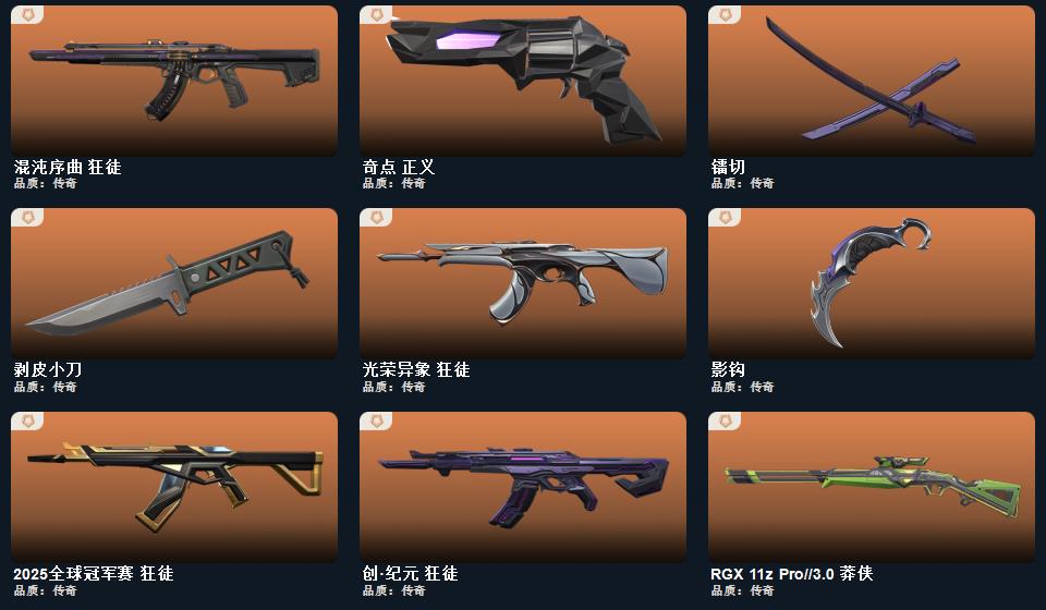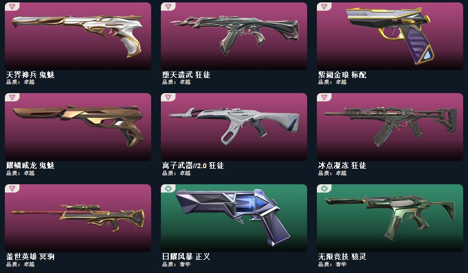 wegame无畏契约★诛心猎手 正义,甜心猎手 短炮,星际猎兵 标配,归零者 短炮,瑰梦艺语 鬼魅,光环序列 狂怒,阿特拉斯指挥部 标配,天界神兵 鬼魅,太空穿梭 正义,悠闲猫生 短炮,日耀风暴 正义,奇点 正义,紫阙金琅 标配,耀鳞威龙 鬼魅