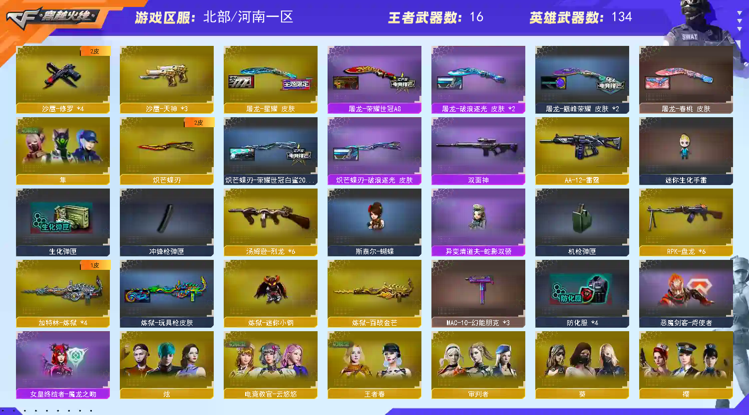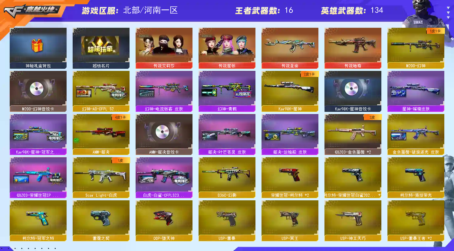 【传说武器】:传说暗裔,传说圣谕【传说角色】:四防传说星骇,四防传说艾莉莎【热门武器】:传说暗裔,传说圣谕,G36C-幻影,QBZ03-金色蔷薇*2,Scar Light-白虎,M200-幻神,柯尔特-荣耀世冠白鲨2023*3,金色蔷薇-古蛇迷踪,修罗-古蛇迷踪,M200-竞技荣光,死亡之眼*2,荣耀世冠-火麒麟,荣耀世冠-雷神,白虎-电玩蓝兔,柯尔特-冠军之特,荣耀世冠-柯尔特*2,Kar98K-星神,金色小号,Cat-刀锋,炼狱-迷你小钢,M4A1-黑骑士*3,汤姆逊-烈龙*6,RPK-盘龙*6,加特林-炼狱*4,斯泰尔-蝴蝶,COP-白鲨,USP-雷暴,COP-堕天神,沙鹰-修罗*4,炽芒蝶刃,炽芒蝶刃-破浪逐光 皮肤,炽芒蝶刃-荣耀世冠白鲨2023 皮肤,荣耀世冠-龙啸,黄金猫猫手套-白鲨,金刚伞【稀有套装】:竞技荣光套【王者炫金武器】:王者之幻,王者凌虎,USP-雷暴王者*2,王者冰锋,炫金火麒麟,炫金雷神,炫金武士,炫金毁灭,炫金天龙【音效卡】:M200-幻神音效卡,AK47-火麒麟音效卡,M4A1-黑骑士音效卡,毁灭音效卡,AWM-裁决音效卡,Kar98K-星神音效卡,M4A1-赤狱骑士-怀旧音效卡,碧霄极光音效卡,炼狱-百战金芒-庆典舞曲音效卡,死神-雪域霜狐-怀旧音效卡,毁灭-怀旧音效卡【皮肤】:幻神-青鹤,幻神-电流骇客 皮肤,幻神-AG-CFPL S24冠军 皮肤,白虎-白鲨-CFPLS23冠军,金色蔷薇-破浪逐光 皮肤,QBZ03-荣耀世冠EP 皮肤,裁决-叶芒苍灵 皮肤,裁决-运输船 皮肤,星神-璀璨皮肤,Kar98K-星神-冠军之星皮肤,雷神-传奇N9,雷神-R.LGD-CFPLS18冠军,雷神-烈虎皮肤,雷神-荣耀世冠AG,AK47-火麒麟-传奇EVEN,毁灭-星耀 皮肤,屠龙-荣耀世冠AG,屠龙-星耀 皮肤,屠龙-春桃 皮肤,屠龙-破浪逐光 皮肤*2,屠龙-巅峰荣耀 皮肤*2,屠龙-惊鸿 皮肤,龙啸-黯钢战甲 皮肤,轻型军用手斧-再燃火线,炽芒蝶刃-荣耀世冠白鲨2023 皮肤,炽芒蝶刃-破浪逐光 皮肤,毁灭-CFS2018,无影-暗月,AK47-B-常胜将军-刘备,修罗-能量核心,屠龙-破浪逐光 皮肤,屠龙-巅峰荣耀 皮肤,毁灭-SV-CFPLS16冠军,雷神-白鲨-CFPLS14冠军【角色】:四防电竞教官-云悠悠,四防鹰,隼,王者-瞳-闭月羞花,四防王者春,雪域霜狐,蛇隐宗,奇洋探员,乔伊教练,修道士,云海玲珑,女战神,【人偶武器】:COP-白鲨,天龙-曼陀罗,火麒麟-灵狐,M4A1-雷神-精英刀锋*2,炼狱-迷你小钢,异变清道夫-蛇影双骄,斯泰尔-蝴蝶,AWM-灵狐-15周年嘉年华,COP-旗袍,Cat-刀锋,迷你深渊冰龙,迷你裂空之翼,迷你波特博士*2,夺魂*2,迷你牛牛,【暴走生化】:双面神,死亡之眼*2【挑战大师】:暴君乱世-超越Max,冰龙粉碎者-白马银枪*3,激光毁灭者III*4,神圣爆裂者-末日III,阐释者III【英雄级武器】:Scar Light-白虎,G36C-幻影,金色蔷薇-古蛇迷踪,QBZ03-金色蔷薇*2,M4A1-猎神,王者之心-觉醒版,王者之势-觉醒版,白虎-电玩蓝兔,荣耀世冠-火麒麟,荣耀世冠-雷神,AWM-天龙*2,Barrett-毁灭,AWM-裁决,M200-幻神,Kar98K-星神,M200-竞技荣光,王者之怒-觉醒版,王者之光-觉醒版,RPK-盘龙*6,加特林-炼狱*4,炼狱-百战金芒,汤姆逊-烈龙*6,AA-12-雷霆,沙鹰-修罗*4,沙鹰-天神*3,USP-雷暴,COP-雷霆,COP-堕天神,柯尔特-冠军之特,柯尔特-荣耀世冠白鲨2023*3,荣耀世冠-柯尔特*2,柯尔特-竞技荣光,USP-神工天巧,USP-冥王,炽芒蝶刃,【道具】:神秘礼盒背包,AG战队炫彩背包,BS战队炫彩背包,CFS限定背包,Q9战队炫彩背包,云山科技背包,亚洲杯纪念炫彩背包,炫彩背包-诺拉,炫彩背包,百战金芒炫彩背包,背包-洛丽塔,虎牙炫彩背包,超级背包*2,雪域霜狐炫彩背包,黑桃战神背包,超核名片,女皇终结者-魔龙之吻,救世主-黑桃战神,黄金生化钩,绿色巨人,灵魂忍者*2,变异宝贝,妖姬*2,迷雾幽灵,夺命之镰*2,防化服*4,金色流光-枪王排位,;USP-雷暴,USP-雷暴王者,荣耀世冠-柯尔特,柯尔特-荣耀世冠白鲨2023,柯尔特-冠军之特,炽芒蝶刃,传说星骇,