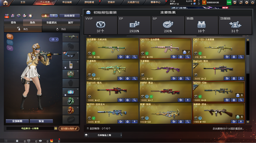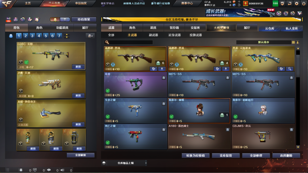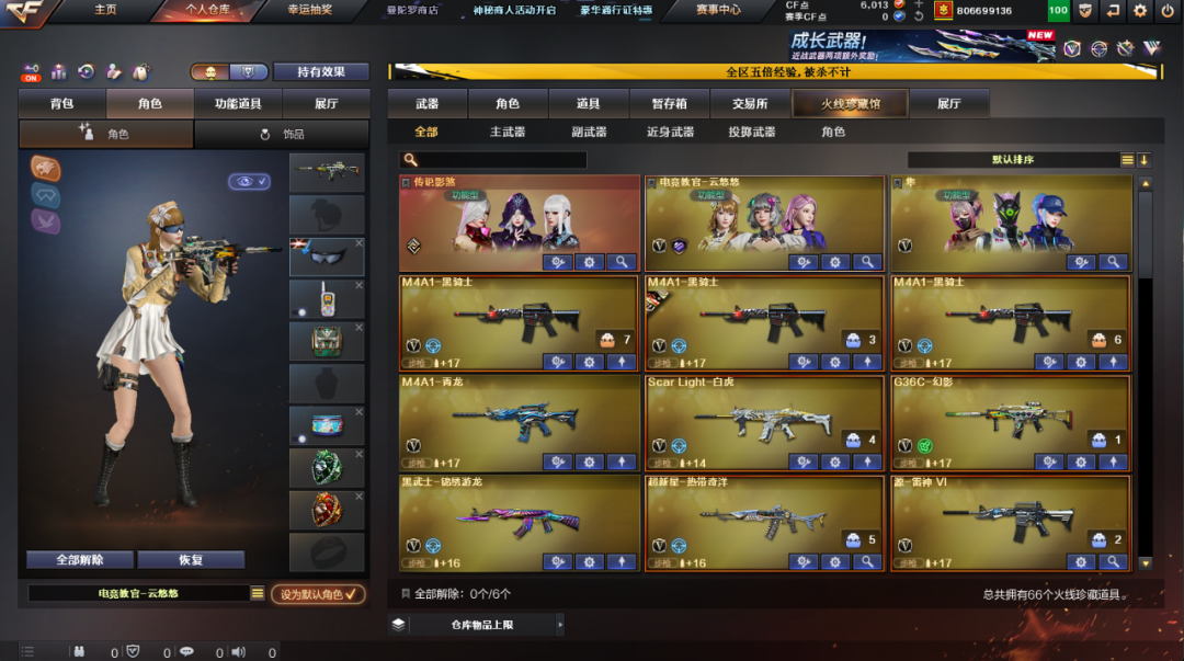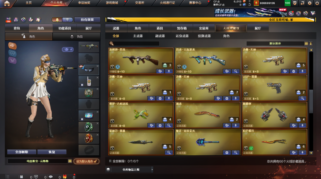 东部生化号;USP-雷暴,炽芒蝶刃,传说影煞,隼,电竞教官-云悠悠,QBZ03-金色蔷薇,G36C-幻影,
