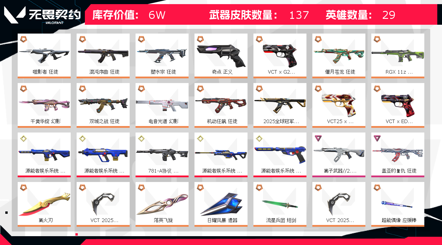 首页 > 租号大厅 > 无畏契约-wegame > wegame/wegame > 137皮,可排位,混沌狂徒,电玩套,盖亚ak ,紫金狂徒,冠军25狂徒,狂徒皮肤多,离火刃,冠军爪刀