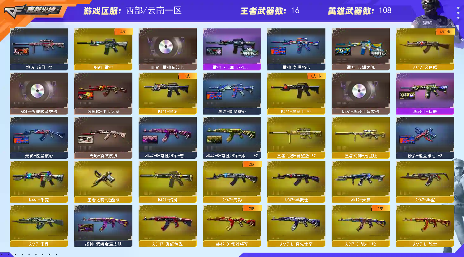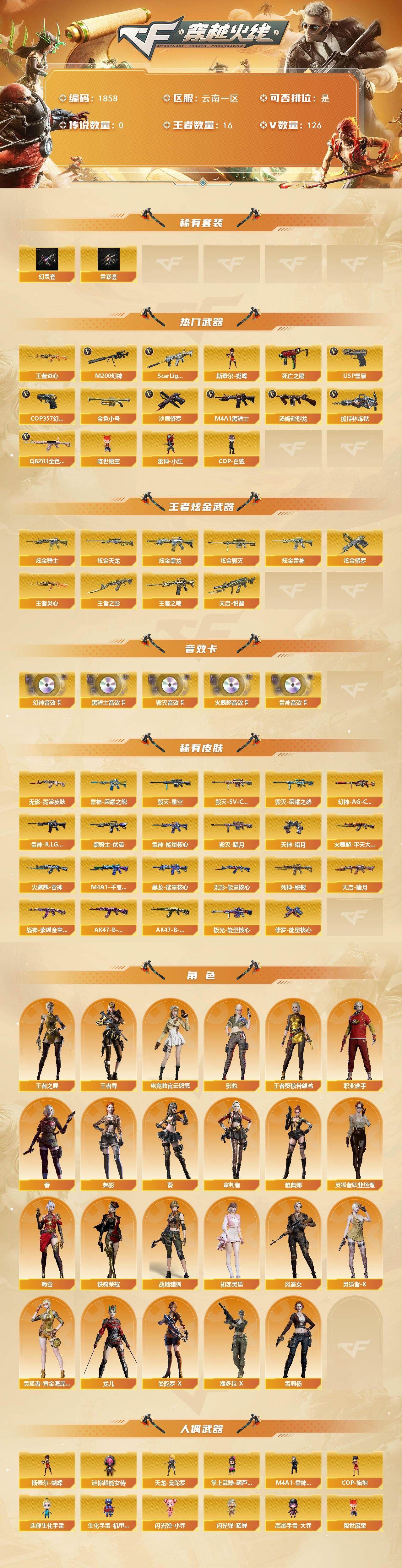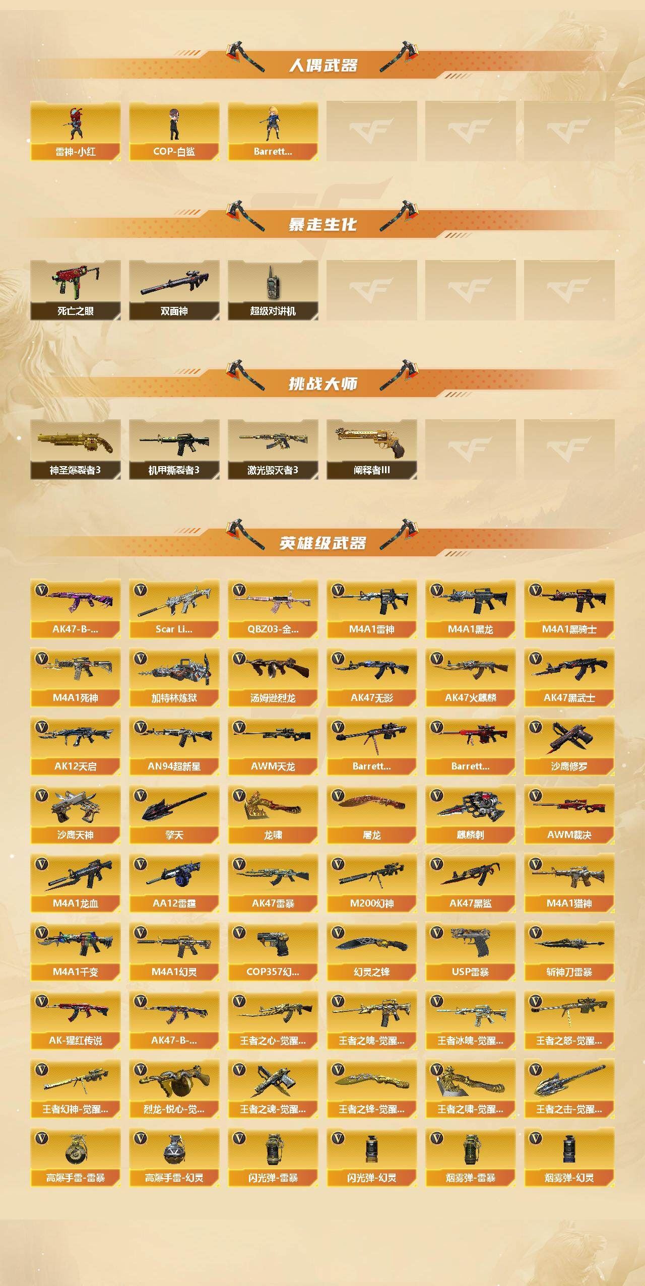 【热门武器】:QBZ03-金色蔷薇,Scar Light-白虎,M200-幻神,死亡之眼,王者炎心,金色小号,M4A1-黑骑士*2,汤姆逊-烈龙*3,加特林-炼狱*3,斯泰尔-蝴蝶,降世魔童,雷神-小红,COP-白鲨,USP-雷暴*2,COP 357-幻灵*2,沙鹰-修罗*5【王者炫金武器】:王者炎心,天启-悦智,王者之影,王者之魄,炫金骑士,炫金黑龙,炫金雷神,炫金毁灭,炫金天龙,炫金修罗【音效卡】:M200-幻神音效卡,AK47-火麒麟音效卡,M4A1-雷神音效卡,M4A1-黑骑士音效卡,Barrett-毁灭音效卡【皮肤】:幻神-AG-CFPLS17冠军,雷神-能量核心,雷神-荣耀之魄,雷神-R.LGD-CFPLS18冠军,火麒麟-雷神,火麒麟-平天大圣,毁灭-暗月*2,毁灭-荣耀之怒,毁灭-星空,毁灭-SV-CFPLS16冠军,M4A1-千变-孔明皮肤,黑龙-能量核心,黑骑士-伏羲,无影-能量核心,无影-霓裳皮肤,死神-秘银,天启-暗月,战神-紫绶金章皮肤,AK47-B-常胜将军-曹操,AK47-B-常胜将军-孙权*2,极光-能量核心,修罗-能量核心*3,天神-暗月【角色】:葵,魅影,春,影豹四防,电竞教官-云悠悠四防,审判者,战地猎狐,王者葵-惊若翩鸿四防,王者-零,王者之瞳,初恋灵狐,风暴女*2,灵狐者-X,灵狐者-黄金海岸,灵狐者-职业经理,龙儿,曼陀罗-X,潘多拉-X,蜀雪,铁骑荣耀,雪莉杨,职业选手,雅典娜【人偶武器】:雷神-小红,COP-白鲨,天龙-曼陀罗,M4A1-雷神-精英刀锋*2,斯泰尔-蝴蝶,COP-旗袍,迷你生化手雷*2,生化手雷-机甲核心,闪光弹-小乔,闪光弹-貂蝉,高爆手雷-大乔,Barrett-曼陀罗,迷你超能女侍,掌上武器-葫芦兄弟,降世魔童【暴走生化】:双面神,死亡之眼,超级对讲机【挑战大师】:神圣爆裂者III,激光毁灭者III,机甲撕裂者III,阐释者III【英雄级武器】:M4A1-千变,AK47-火麒麟,M4A1-黑龙,M4A1-雷神,M4A1-黑骑士*2,AK47-无影,M4A1-死神,AK47-黑武士,AK12-天启,AN94-超新星,AK47-黑鲨,M4A1-龙血,AK47-雷暴,Scar Light-白虎,M4A1-幻灵,QBZ03-金色蔷薇,M4A1-猎神,王者之心-觉醒版,王者之魄-觉醒版,AK-47-猩红传说,AK47-B-战神*2,王者冰魄-觉醒版,AK47-B-常胜将军,AWM-天龙*2,Barrett-毁灭*3,Barrett-极光,AWM-裁决,M200-幻神,王者之怒-觉醒版*2,王者幻神-觉醒版,加特林-炼狱*3,汤姆逊-烈龙*3,烈龙-悦心-觉醒版,AA-12-雷霆,沙鹰-修罗*5,沙鹰-天神*2,USP-雷暴*2,COP 357-幻灵*2,王者之魂-觉醒版,屠龙*5,龙啸,擎天*2,麒麟刺,幻灵之锋*2,斩神刀-雷暴,王者之锋-觉醒版*2,王者之啸-觉醒版,王者之击-觉醒版,高爆手雷-雷暴*7,高爆手雷-幻灵*7,闪光弹-雷暴*7,闪光弹-幻灵*7,烟雾弹-雷暴*7,烟雾弹-幻灵*7【道具】:XROCK炫彩背包,云海游龙炫彩背包,战舰背包,炫彩背包,超级背包*2,救世主-黑桃战神,变异宝贝,夺命之镰,防化服,金色流光-枪王排位*2,星辰流光-枪王排位,枪王排位29赛季金色流光,电玩兔兔表情,CFPL选手表情-第1套,CFPL选手表情-第2套,防弹头盔*4,防弹衣*3,C4工具钳*3,手雷包*2【特殊枪械】:蝴蝶斯泰尔+3烈龙,1白虎,2黑骑士,3烈龙,3炼狱,1蝴蝶斯泰尔【稀有套装】:雷暴套,幻灵套;USP-雷暴,电竞教官-云悠悠,QBZ03-金色蔷薇,M200-幻神,Scar Light-白虎,