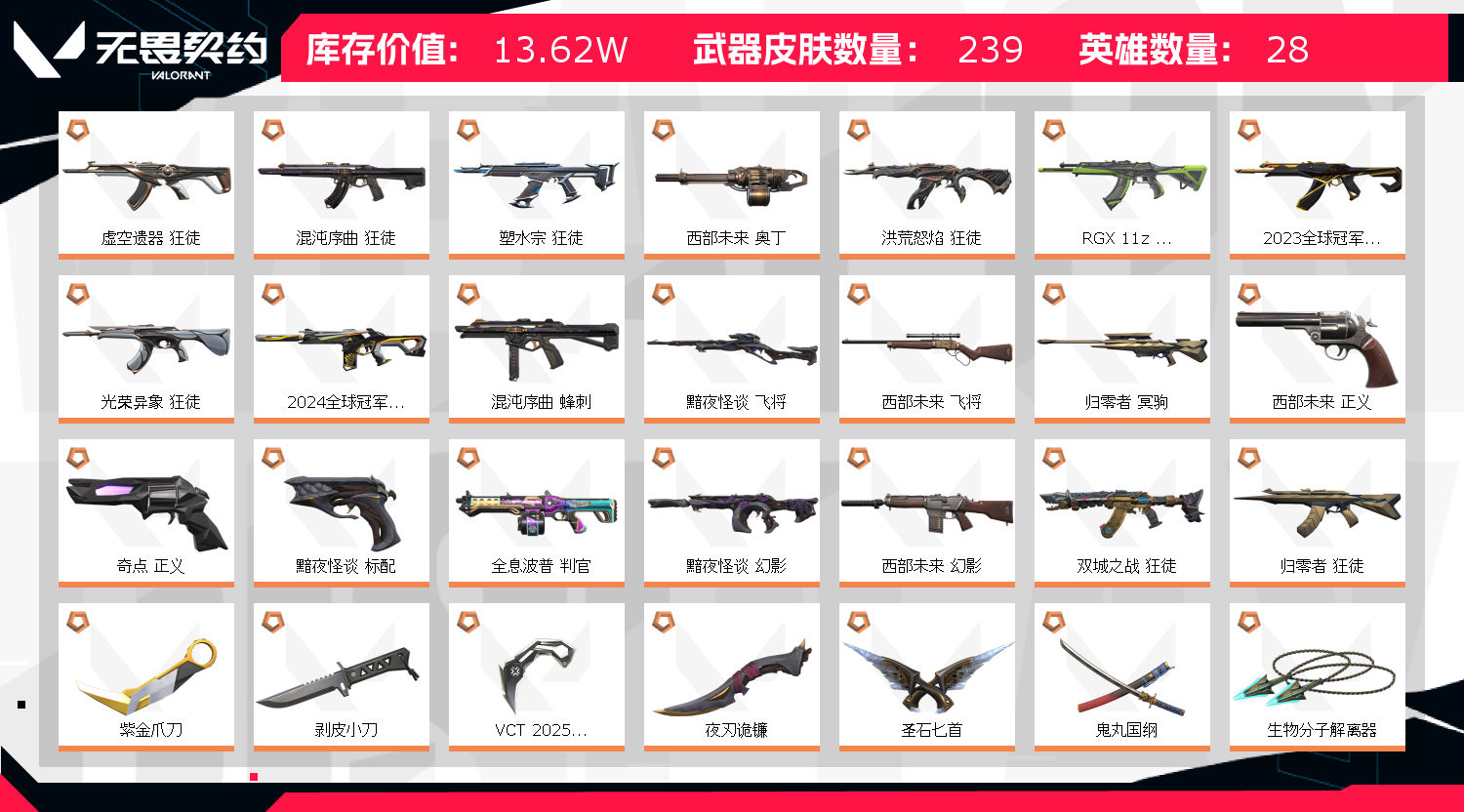 混沌套/西部套/奇点正义/双城之战套/黯夜怪谈套/24冠军套/23冠军狂徒/天玄刀/vctcn2025爪刀/光谱标配/光荣ak/22冠军套/怜悯之刃/圣石匕首/般若假面套/掠影ak/盖世英雄ak/塑水宗ak/盖亚ak/离子大狙/离子正义/紫金ak/紫金标配/波谱判官/剥皮小刀/归零者ak/侦查幻影/超时空ak/超时空鬼魅/艾沃莉ak;西部未来 奥丁,紫金爪刀,剥皮小刀,VCT 2025 爪刀,盖亚的复仇 狂徒,虚空遗器 狂徒,洪荒怒焰 狂徒,