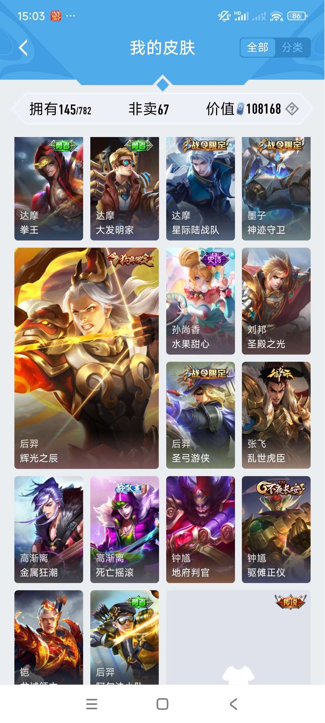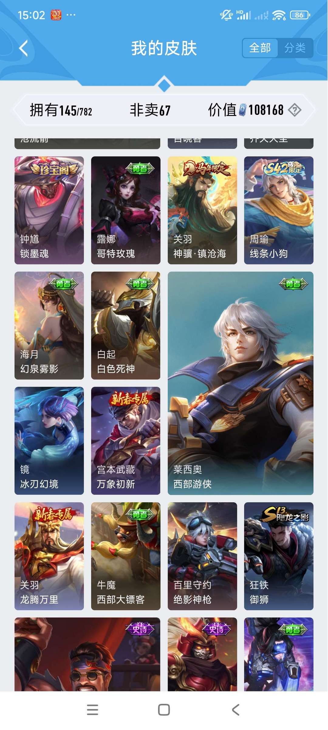 【非沄直接上号】极品V10★三历史国标★430皮★六典藏★诸葛亮新典藏★虎年五限定★鸣剑戈影★活力突击️★多限定