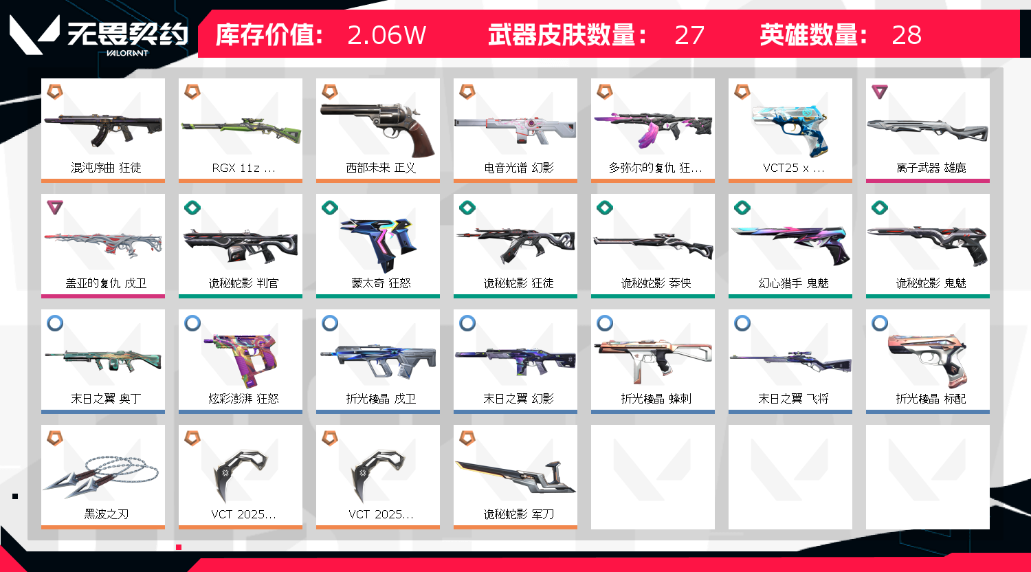 黑波之刃✨VCT爪刀✨混沌 多弥尔 狂徒✨电音幻影✨盖亚戍卫✨西部正义✨离子雄鹿✨显卡莽侠 冻结秒解不要撤单!冻结秒解不要撤单!冻结秒解不要撤单! 您租赁过程中异地冻结请及时点击维权我们解决 请点击解除冻结,全天在线解冻 炸鱼轻点炸 控控分不要得MVP 账号来之不易望各位租客谅解 ⚠️严禁挂机秒退,如发现挂机,我们会根据违规程度对您进行拉黑处理!!! 人头超过30以上就会导致炸鱼封禁,弹出炸鱼导致的禁赛拉黑⚠️如果上号正在有人玩,可能是上一租客留下的对局,不用着急退单,我们会赠送您时间游玩 禁止开挂!每个登录的账号都有实时监控,如发现开挂上号我们会立即对您拉黑! 谢谢各位租客支持;黑波之刃,VCT 2025 爪刀,混沌序曲 狂徒,RGX 11z Pro//3.0 莽侠,西部未来 正义,