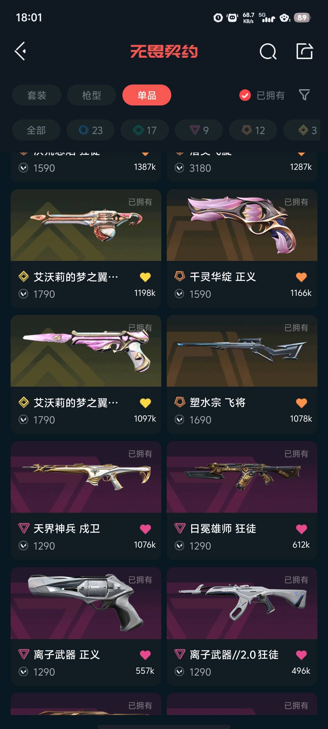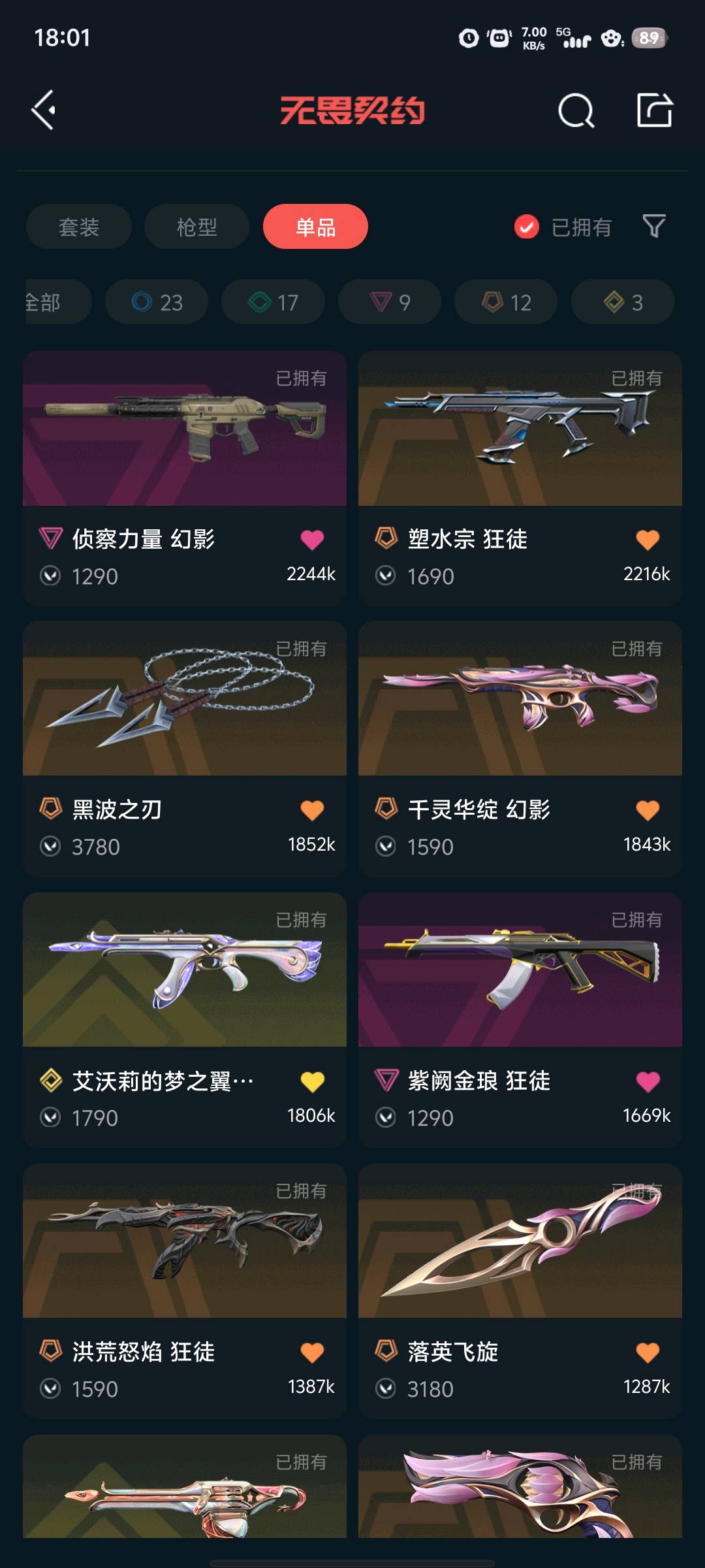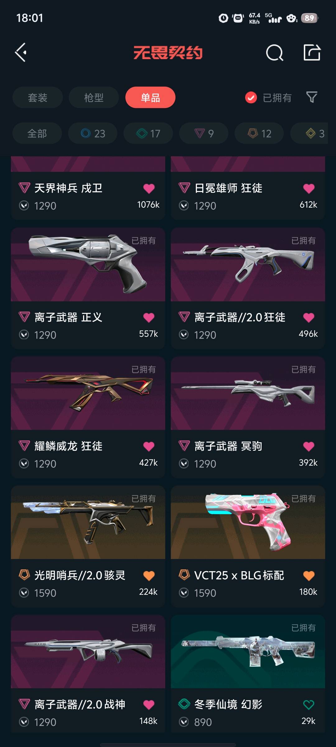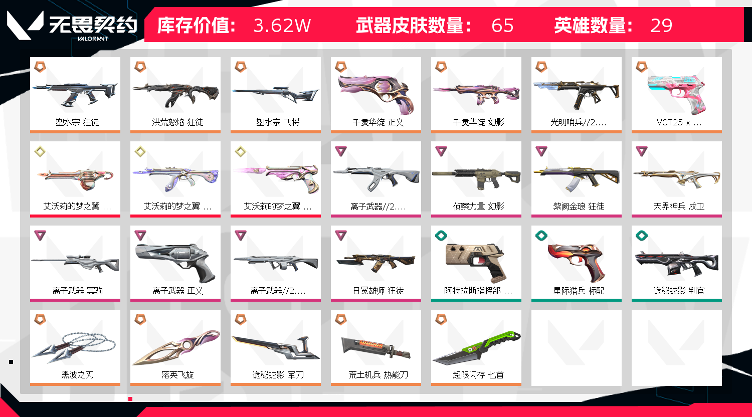 - 近战:黑波之刃、落英飞旋 ​ - 幻影:侦察力量、千灵华绽、冬季仙境 ​ - 狂徒:塑水宗、紫阙金琅、洪荒怒焰、日冕雄师、离子武器//2.0、耀鳞威龙 ​ - 正义:千灵华绽、艾沃莉的梦之翼、离子武器、VCT25 x BLG ​ - 其他:塑水宗飞将、离子武器冥驹/战神、光明哨兵//2.0骇灵等;艾沃莉的梦之翼 奥丁,黑波之刃,洪荒怒焰 狂徒,侦察力量 幻影,紫阙金琅 狂徒,天界神兵 戍卫,塑水宗 狂徒,