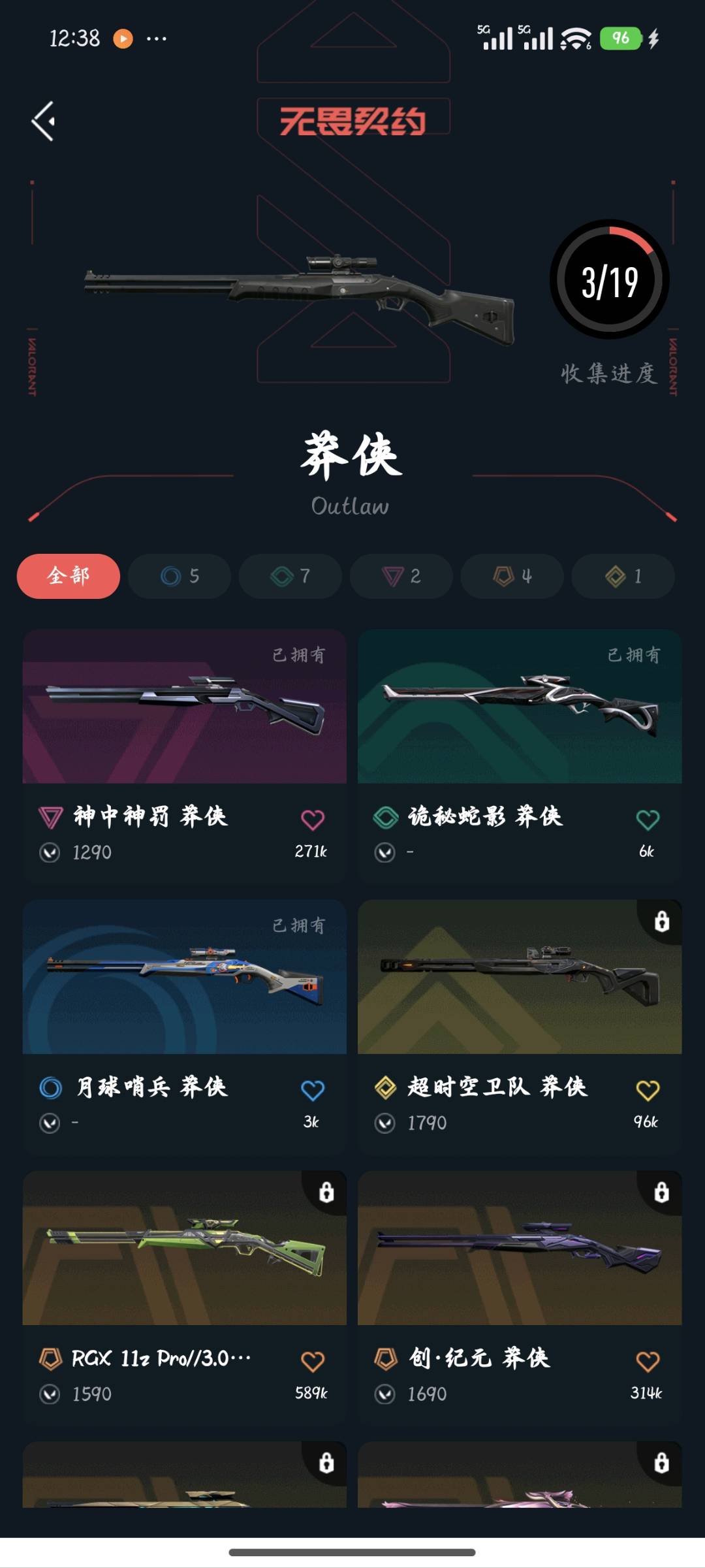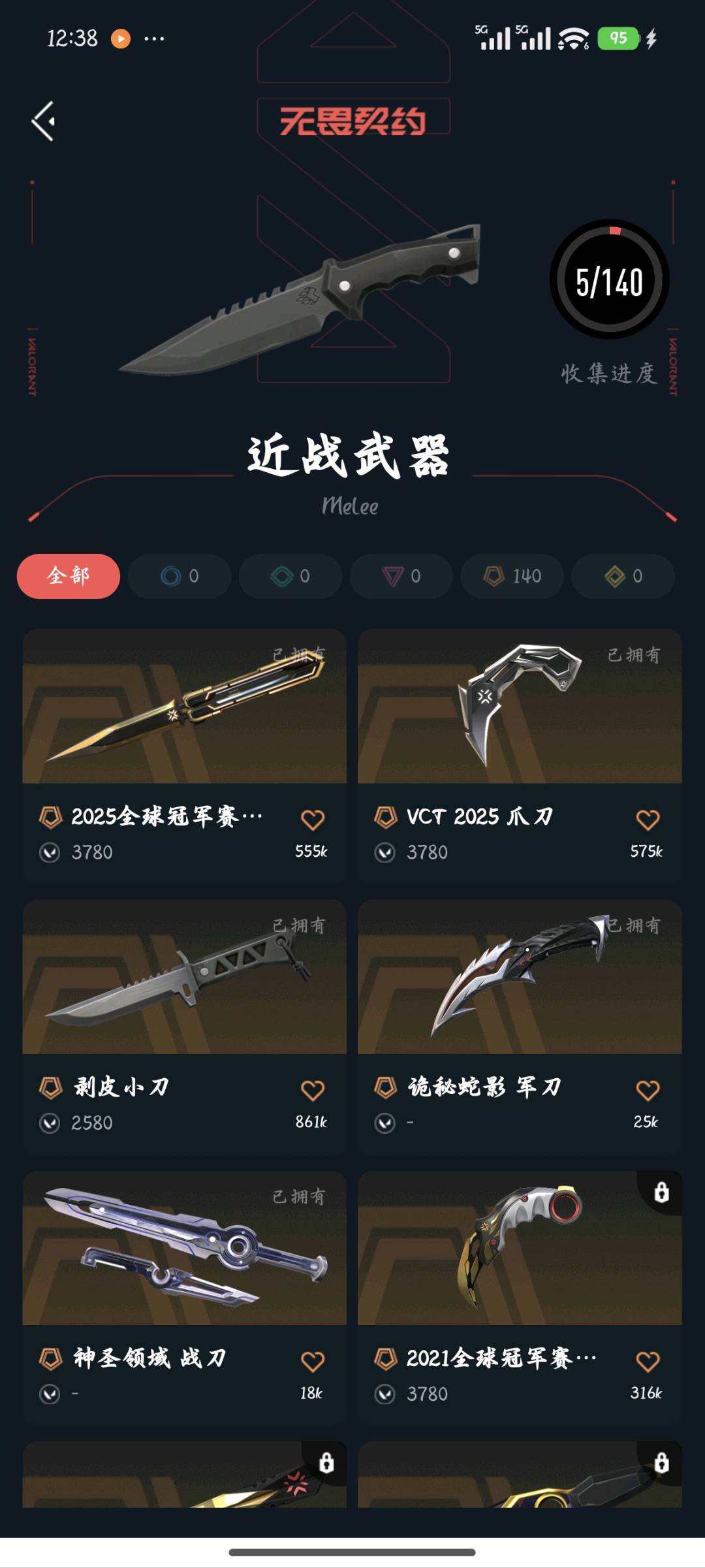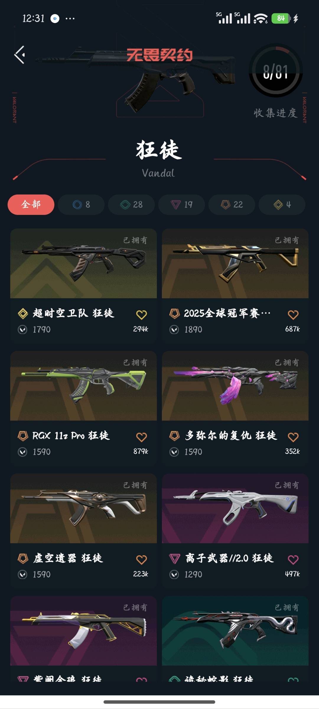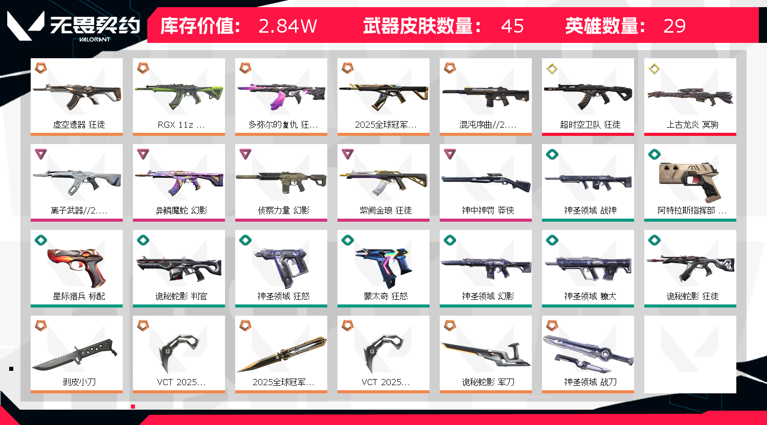 允许 英雄28 武器皮肤数量44;剥皮小刀,VCT 2025 爪刀,虚空遗器 狂徒,异鳞魔蛇 幻影,侦察力量 幻影,紫阙金琅 狂徒,RGX 11z Pro 狂徒,