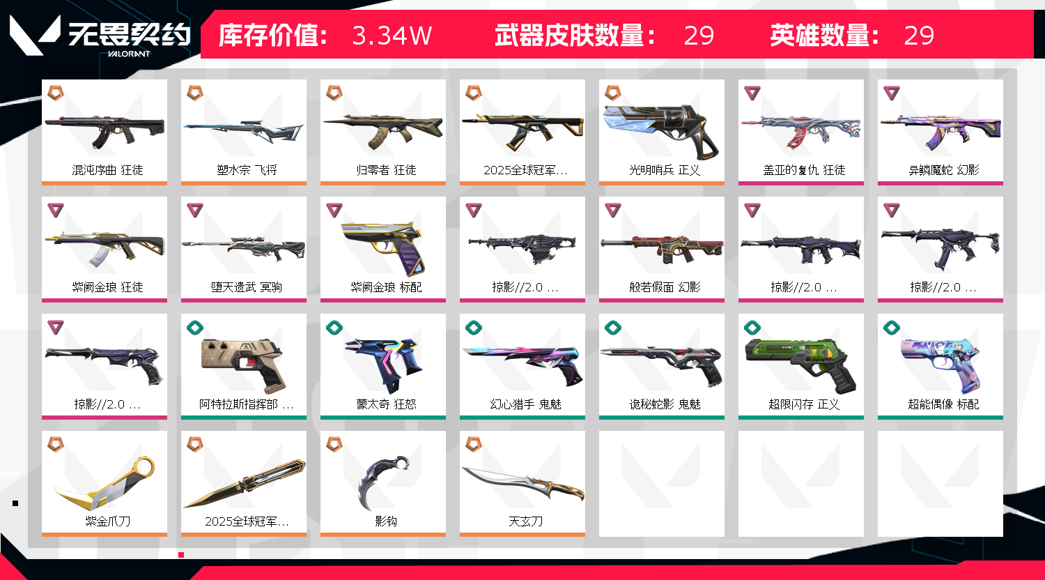 允许 英雄28 武器皮肤数量29;紫金爪刀,盖亚的复仇 狂徒,异鳞魔蛇 幻影,紫阙金琅 狂徒,混沌序曲 狂徒,塑水宗 飞将,堕天遗武 冥驹,
