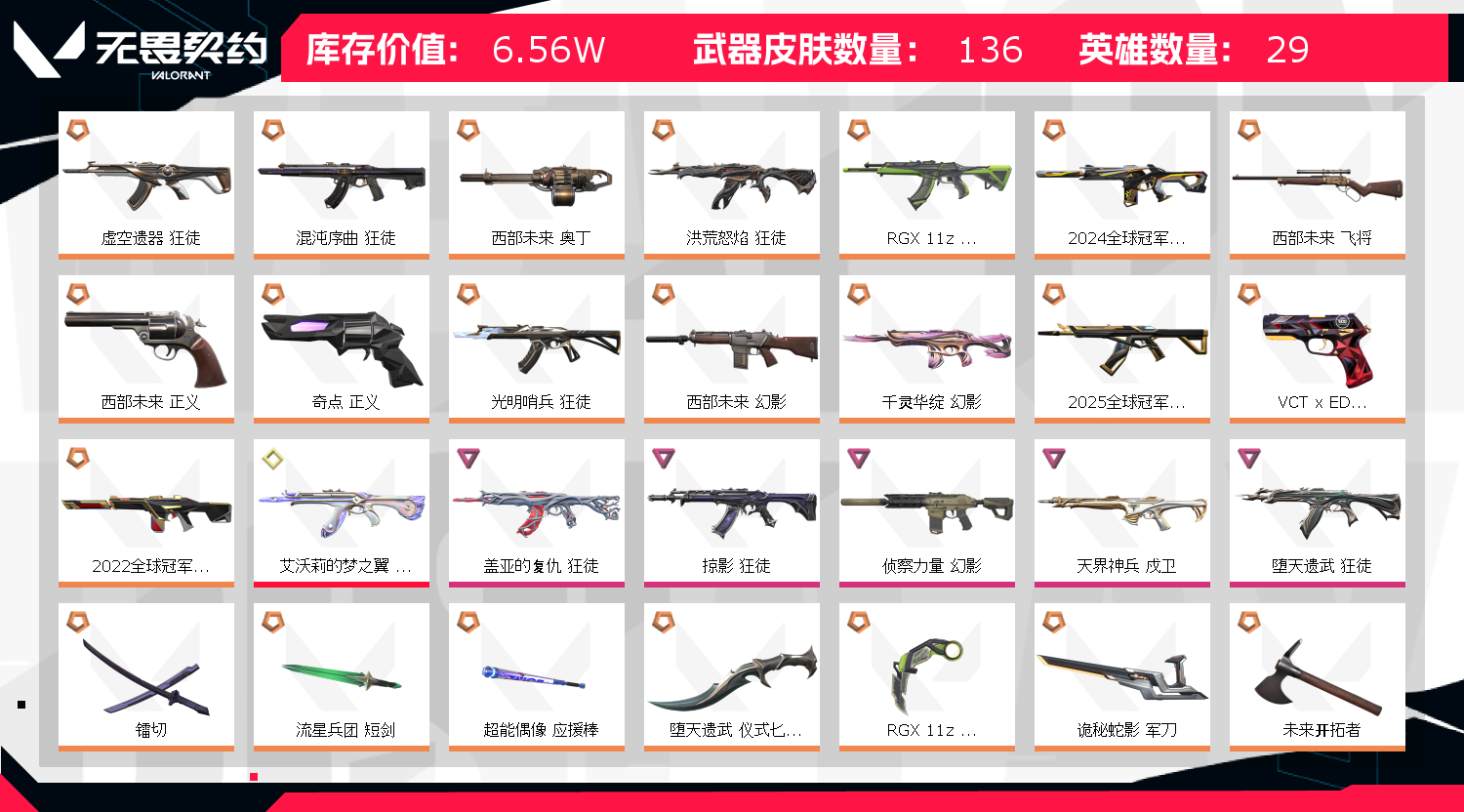 允许 英雄26 武器皮肤数量135;西部未来 奥丁,镭切,盖亚的复仇 狂徒,虚空遗器 狂徒,洪荒怒焰 狂徒,掠影 狂徒,侦察力量 幻影,