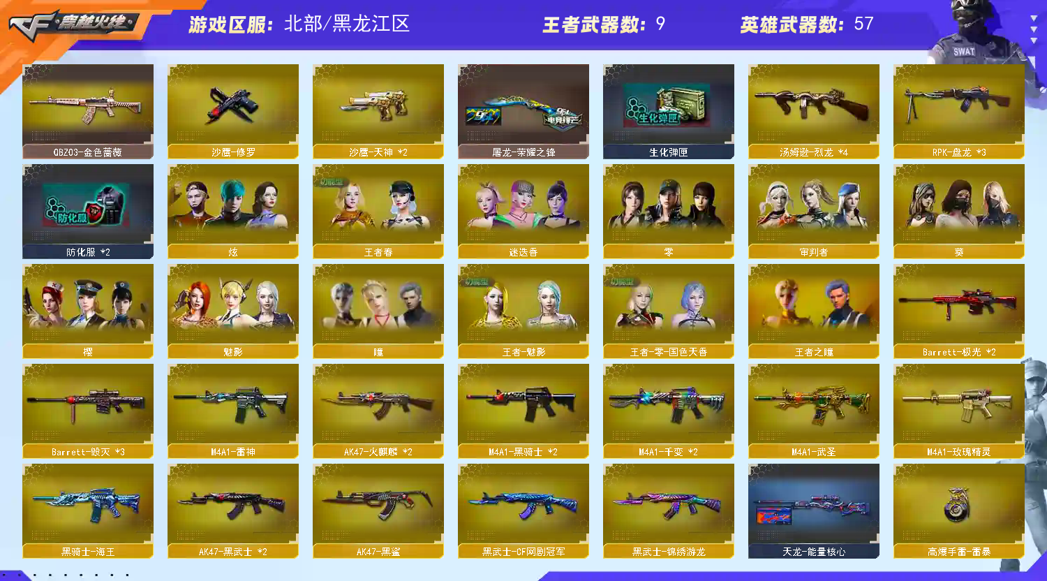 57V毁灭火麒麟雷神黑骑士玫瑰精灵金色蔷薇烈火极光天龙武圣黑武士;RPK-盘龙,QBZ03-金色蔷薇,