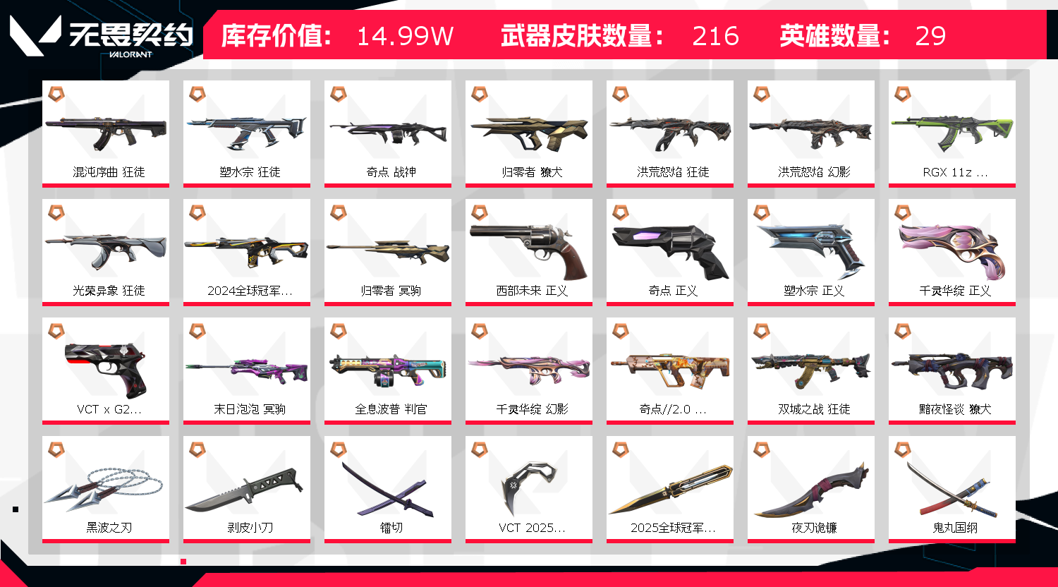 15万库存♥2524冠军套♥末日泡泡套♥离子武器2.0套♥奇点2.0套♥洪荒怒焰套♥vct2025