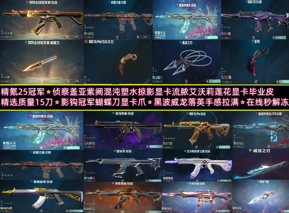 精氪25冠军⭐侦察盖亚紫阙混沌塑水掠影显卡流脓艾沃莉莲花显卡毕业皮 精选质量15刀⭐影钩冠军蝴蝶刀显卡爪⭐黑波威龙落英手感拉满⭐在线秒解冻;黑波之刃,威龙之刃,上古龙炎 判官,归零者 獠犬,盖亚的复仇 狂徒,洪荒怒焰 狂徒,掠影 狂徒,