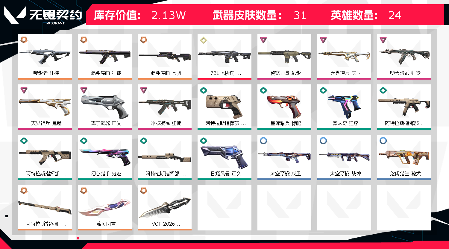离子正义,天界鬼魅,天界戍卫,噬影者狂徒,堕天遗物狂徒,冰点狂徒,侦查力量幻影,781协议幻影,混沌序曲冥狙,VCT2026篆刀,流风回雪刀皮。;