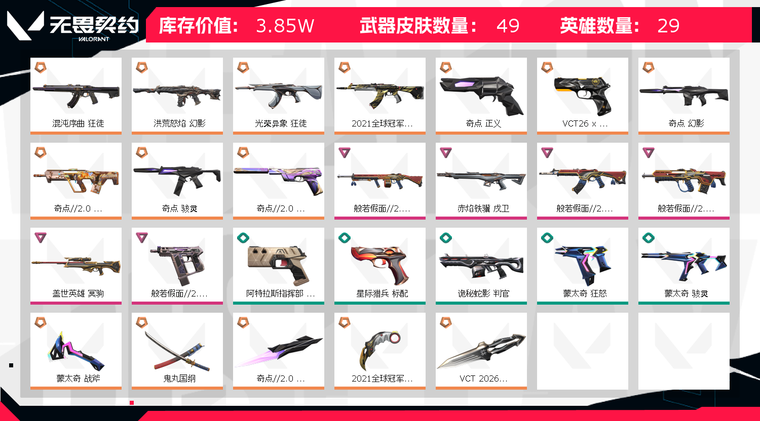 首页 > 租号大厅 > 无畏契约-wegame > wegame/wegame > 炸鱼丧m✨21冠军套❤️新26VCT篆刀❤️奇点2.0套❤️假面鬼丸套❤️光荣+混沌流脓马年戍卫