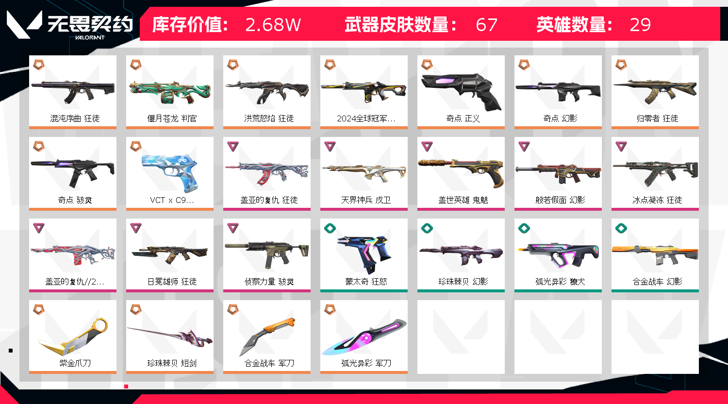 首页 > 租号大厅 > 无畏契约-wegame > wegame/wegame > 青铜炸鱼极品带妹号,24冠军幻影,全是T0狂徒,紫金爪,VCT标配等T0皮肤