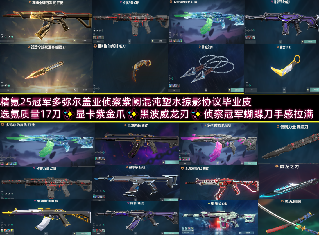 选氪17刀✨显卡紫金爪✨黑波威龙刃✨侦察冠军蝴蝶刀✨25冠军多弥尔盖亚侦察紫阙混沌塑水掠影协议毕业皮
