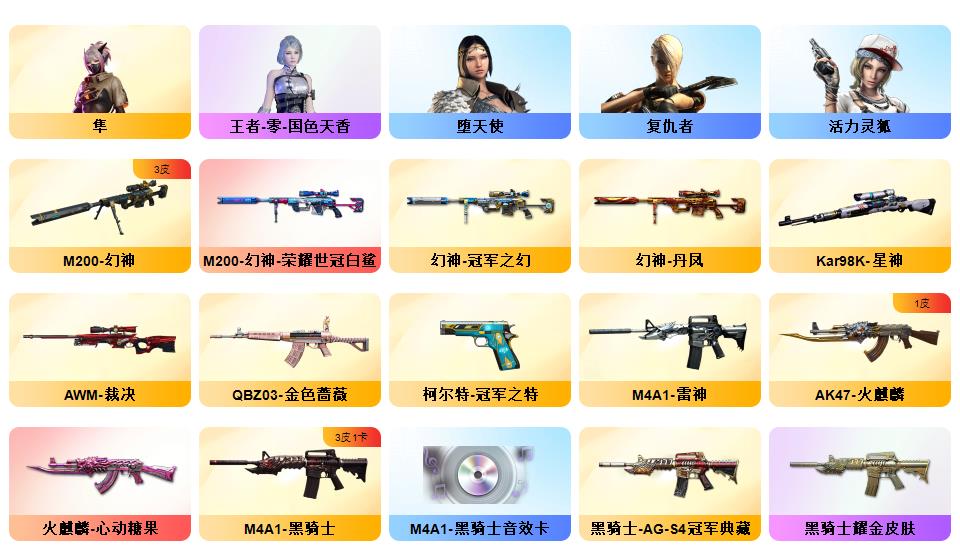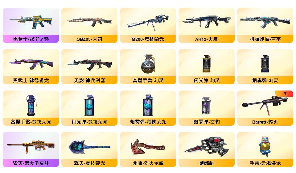 山西一区 可排位 《2m200幻神+幻神丹凤+幻神荣耀世冠白鲨+幻神冠军之幻》《98k星神》《裁决》《m200竞技荣光》《柯尔特冠军之特》《冠军之刃》《qbz天罚》《王者凤鸣》《qbz金色蔷薇》《毁灭》《火麒麟》《雷神》《黑骑士》《隼 4防王者零国色天香 云海玲珑 女主播》《ag战队炫彩背包 bs战队炫彩背包 超级背包》《黑骑士音效卡》《黑骑士冠军之势》《永久ac 永久工具钳 永久手雷包》