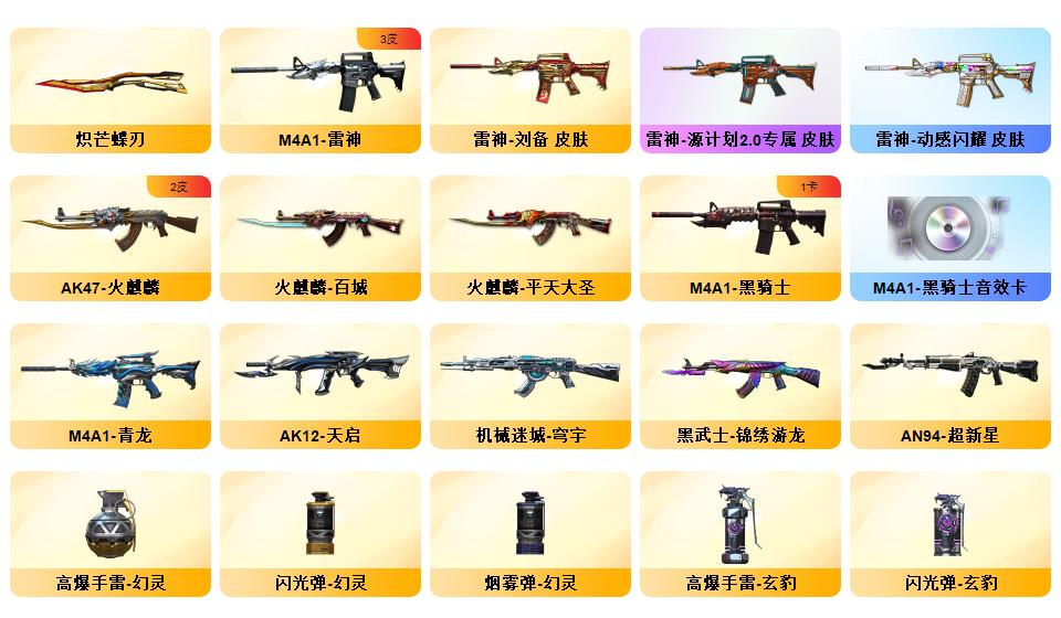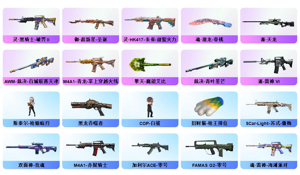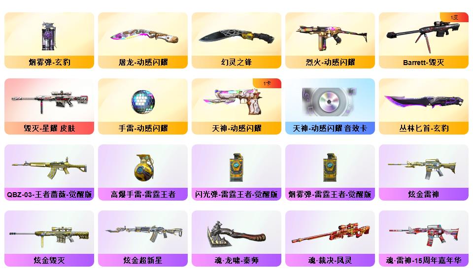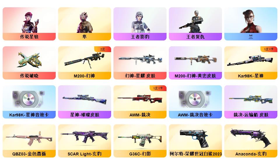 《传说星骇》《m200幻神+星耀皮肤+黄忠皮肤》《98k星神+璀璨皮肤+星神音效卡》《传说破晓》《炽芒蝶刃》《柯尔特荣耀世冠白鲨2023》《玄豹套装》《裁决+运输船皮肤+裁决音效卡》《g36c幻影》《觉醒qbz王者蔷薇》《qbz金色蔷薇+荣耀世冠白鲨皮肤》《m4青龙》《黑武士锦绣游龙》《烈火动感闪耀+天神动感闪耀+屠龙动感闪耀+手雷动感闪耀》《COP白鲨》角色《隼》《云海玲珑》《乔伊教练》《王者复仇