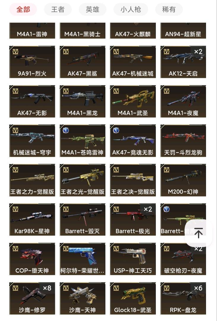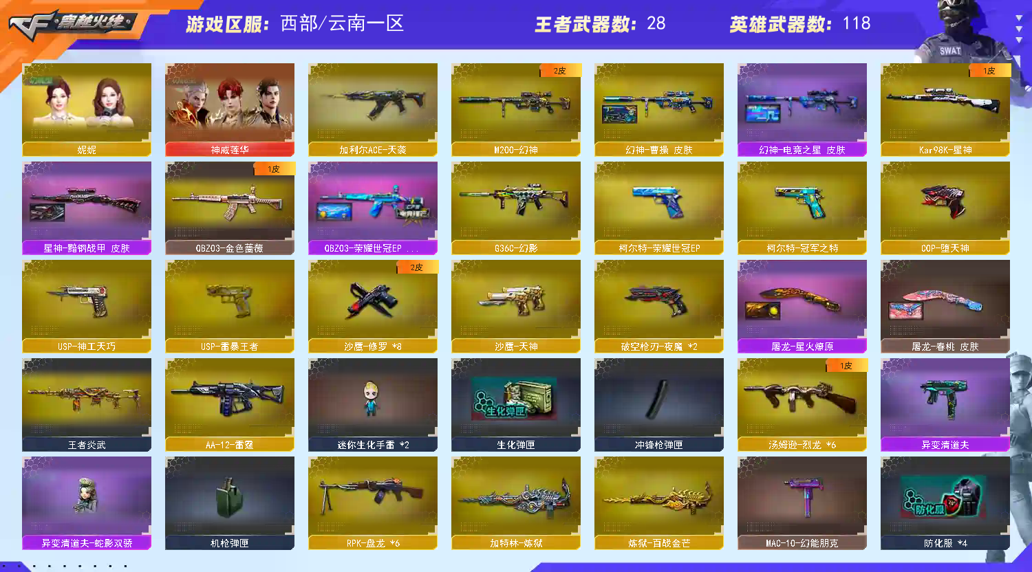 请勿开挂;USP-雷暴王者,柯尔特-冠军之特,妮妮,RPK-盘龙,QBZ03-金色蔷薇,G36C-幻影,M200-幻神,