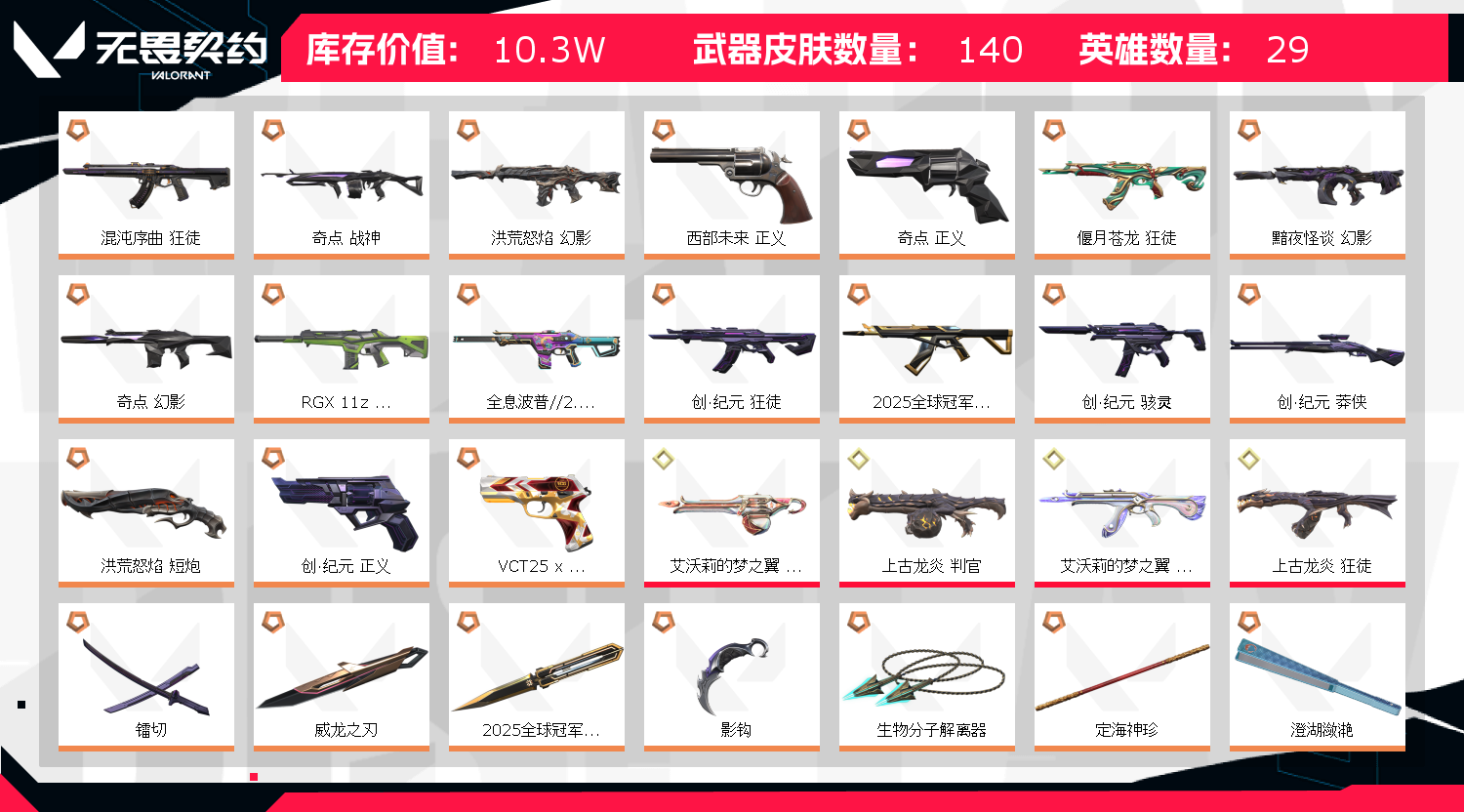 近战武器-澄湖滟、近战武器-灵魂冲击镰刃、近战武器-定海神珍、近战武器-威龙之刃、近战武器-命运权杖、近战武器-艾沃莉的魔法棒、近战武器-生物分子解离器、近战武器-龙爪、近战武器-神圣领域战刀、近战武器-镭切、近战武器-RGX11ZPr02.0蝴蝶刀、近战武器-离子武器2.0爪刀、近战武器-诡秘蛇影军刀、近战武器-阿特拉斯指挥部甩棍、近战武器-影钩、近战武器-星际猎兵短剑、近战武器-2025全球冠军赛蝴蝶刀、近战武器- 碎心裂刃 狂徒-紫阙金琅、狂徒-盖亚的复仇、狂徒-偃月苍龙、狂徒-盖世英雄、狂徒-巨神铁甲、狂徒-日冕雄师、狂徒-艾沃莉的梦之翼、狂徒-混沌序曲、狂徒-般若假面 2.0、狂徒-上古龙炎、狂徒-创纪元、狂徒-离子武器2.0、狂徒-阿特拉斯指挥部、狂徒-2025全球冠军赛、狂徒-瑰梦艺语、狂徒-幻心猎手、狂徒-诡秘蛇影 幻影-奇点、幻影-侦察力量、幻影-紫阙金琅2.0、幻影-巨神铁甲、幻影-洪荒焰、幻影-全息波普2.0、幻影-黯夜怪谈、幻影-RGX11zPro2.0、幻影-悠闲猫生、幻影-星际猎兵、幻影-日耀风暴、公影-甜心猎手、幻影-神圣领域、幻影-末;艾沃莉的梦之翼 奥丁,奇点 战神,镭切,威龙之刃,上古龙炎 判官,盖亚的复仇 狂徒,侦察力量 幻影,