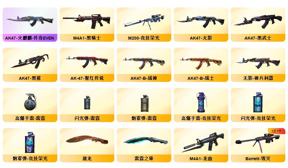 【幻神+幻神宠儿】usp雷暴+竞技柯尔特【m200竞技荣光 星神】【火麒麟even 毁灭绿豆 雷神宠儿 雷神n9 毁灭冠军之怒】【毁灭音效卡】【王者之翼 王者之魄 王者冰魄】【qbz金色蔷薇 火麒麟 雷神 毁灭】【竞技荣光套】【毁灭孙三炮】【云悠悠】ac+工具包+手雷包