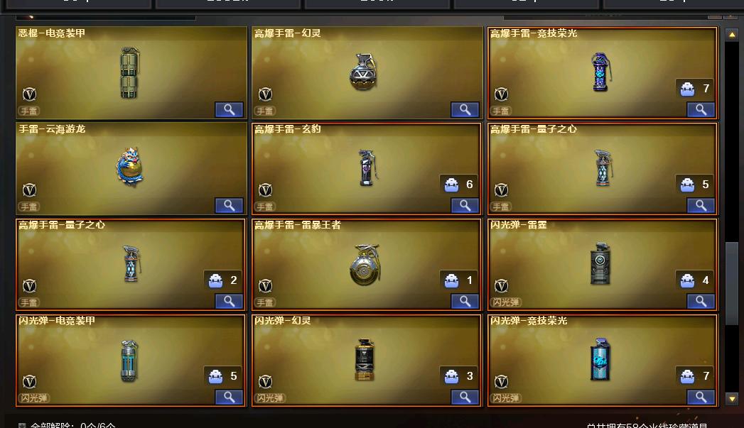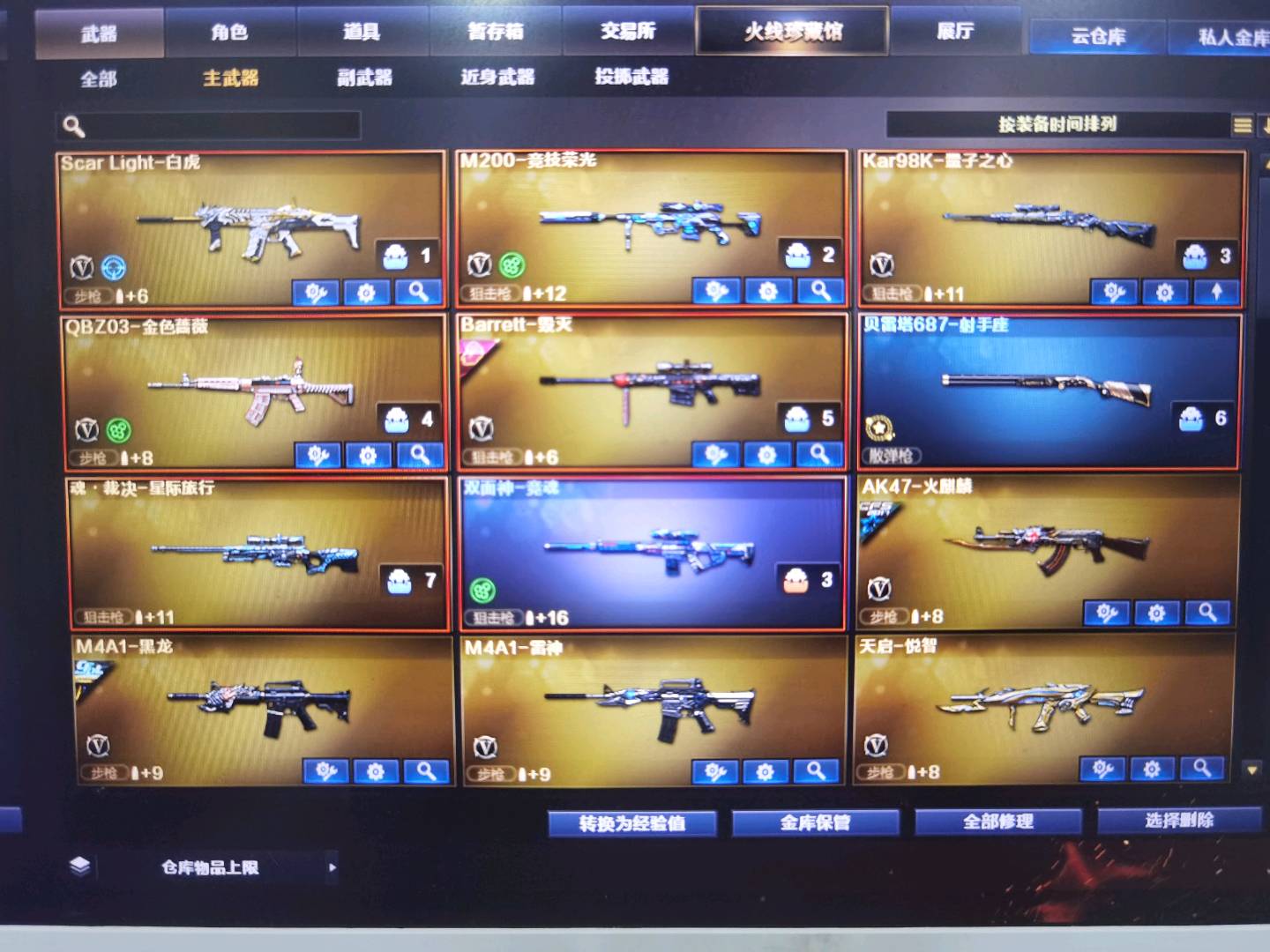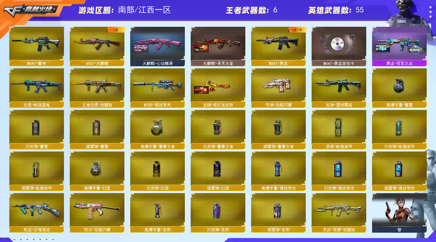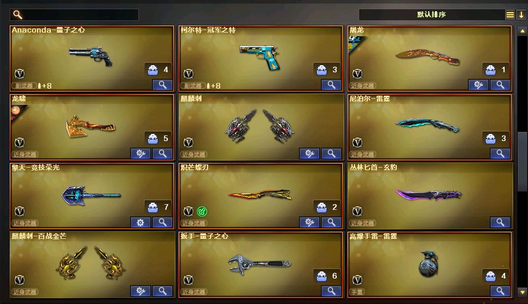 USP:神工天巧,冥王;COP雷霆;冠军之特,荣光柯尔特;角色智、司雨、王者沙漠玫瑰;竞技荣光套装、量子之心套装;蝴蝶刀、屠龙,玄豹刀+雷,麒麟刺;柯尔特-冠军之特,炽芒蝶刃,王者沙漠玫瑰,QBZ03-金色蔷薇,Scar Light-白虎,