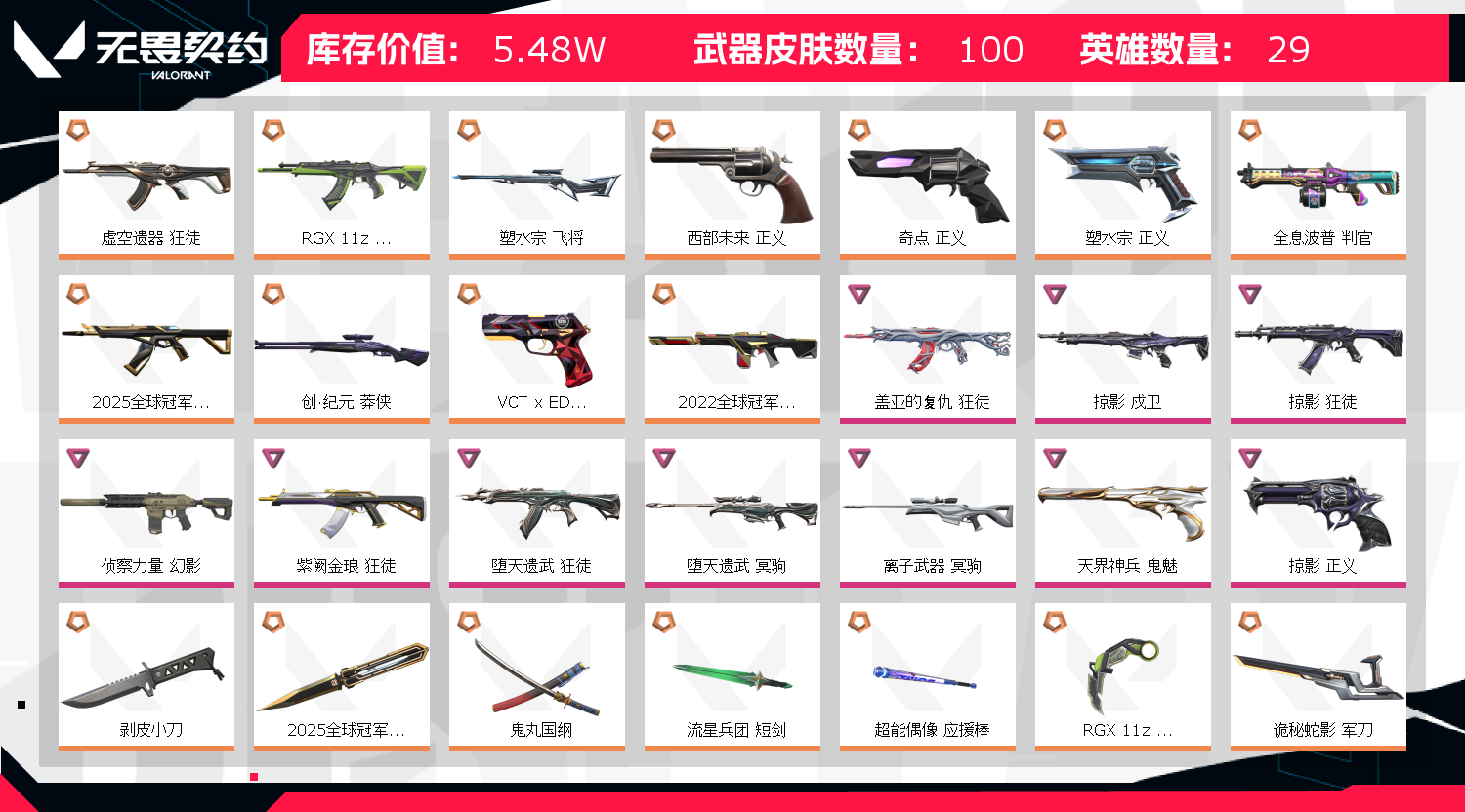 允许 英雄28 武器皮肤数量100;剥皮小刀,盖亚的复仇 狂徒,虚空遗器 狂徒,掠影 戍卫,掠影 狂徒,侦察力量 幻影,紫阙金琅 狂徒,