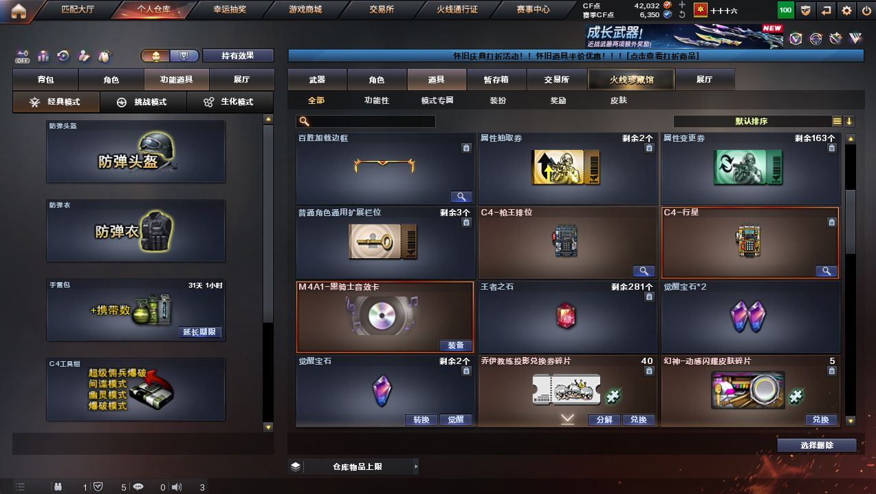 【传说武器】:传说梦魇【热门武器】:传说梦魇,QBZ03-金色蔷薇,M14EBR-玄武,Scar Light-白虎,M200-幻神,金色蔷薇-古蛇迷踪,修罗-古蛇迷踪,M200-竞技荣光,白虎-电玩蓝兔,M4A1-黑骑士,USP-雷暴,COP-堕天神,沙鹰-修罗【稀有套装】:竞技荣光套【王者炫金武器】:王者青龙,王者凤吟,王者玉锋,炫金修罗【音效卡】:M4A1-黑骑士音效卡【皮肤】:幻神-丹凤,幻神-CFS2022,幻神-电流骇客 皮肤,白虎-电玩粉兔皮肤,雷神-烈虎皮肤,毁灭-风暴,毁灭-英雄计划 皮肤,黑骑士-CFS2021,战神-紫绶金章皮肤,战神-流金岁月皮肤,屠龙-荣耀之锋【角色】:四防电竞教官-云悠悠,四防鹰,王者凌霄,蛇隐宗,乔伊教练,修道士,初恋灵狐,芳心审判者,嘉年华灵狐,潘多拉-X,蛇姬,四防樱-青春偶像【人偶武器】:AWM-灵狐-15周年嘉年华,M37-葵,夺魂,迷你超能女侍【暴走生化】:黑龙吞噬者,超级对讲机【挑战大师】:VEPR-12-金魔,激光毁灭者III【英雄级武器】:AK47-火麒麟,M4A1-黑龙,M4A1-雷神,M4A1-黑骑士,AK12-天启,AK47-机械迷城,M4A1-龙血,Scar Light-白虎,M14EBR-玄武,金色蔷薇-古蛇迷踪,QBZ03-金色蔷薇,烈火-动感闪耀,王者之幻-觉醒版,超新星-悦享-觉醒版,AK-47-猩红传说*2,王者之烈-觉醒版,王者白虎-觉醒版,白虎-电玩蓝兔,Barrett-毁灭,M200-幻神,M200-竞技荣光,王者之怒-觉醒版,王者星神-觉醒版,王者森决-觉醒版,炼狱-风暴,沙鹰-修罗,USP-雷暴,COP-堕天神,柯尔特-竞技荣光*3,天神-动感闪耀,修罗-古蛇迷踪,屠龙,马来剑-夜魔,麒麟刺*6,擎天-竞技荣光,屠龙-动感闪耀,高爆手雷-夜魔*3,高爆手雷-竞技荣光*3,手雷-动感闪耀,高爆手雷-古蛇迷踪,闪光弹-夜魔*3,闪光弹-竞技荣光*3,烟雾弹-夜魔*3,烟雾弹-竞技荣光*3,烟雾弹-古蛇迷踪【道具】:喜狮迎春背包,古蛇迷踪炫彩背包,炫彩背包,超级背包,救世主-黑桃战神,绿色巨人,灵魂忍者,迷雾幽灵,夺命之镰,防化服*2,金色流光-枪王排位,枪王排位29赛季金色流光,古蛇迷踪特效,蛇隐宗表情,电玩兔兔表情,动感闪耀表情,防弹头盔*5,防弹衣*5,C4工具钳*4,手雷包*4,;USP-雷暴,电竞教官-云悠悠,QBZ03-金色蔷薇,M200-幻神,Scar Light-白虎,