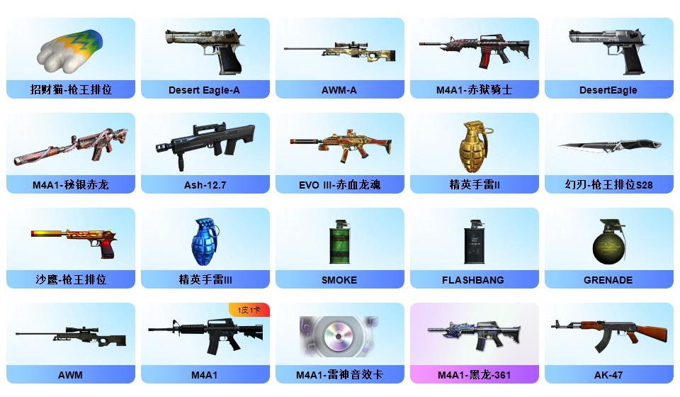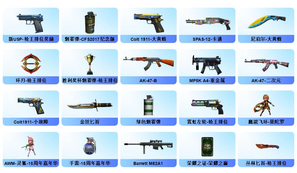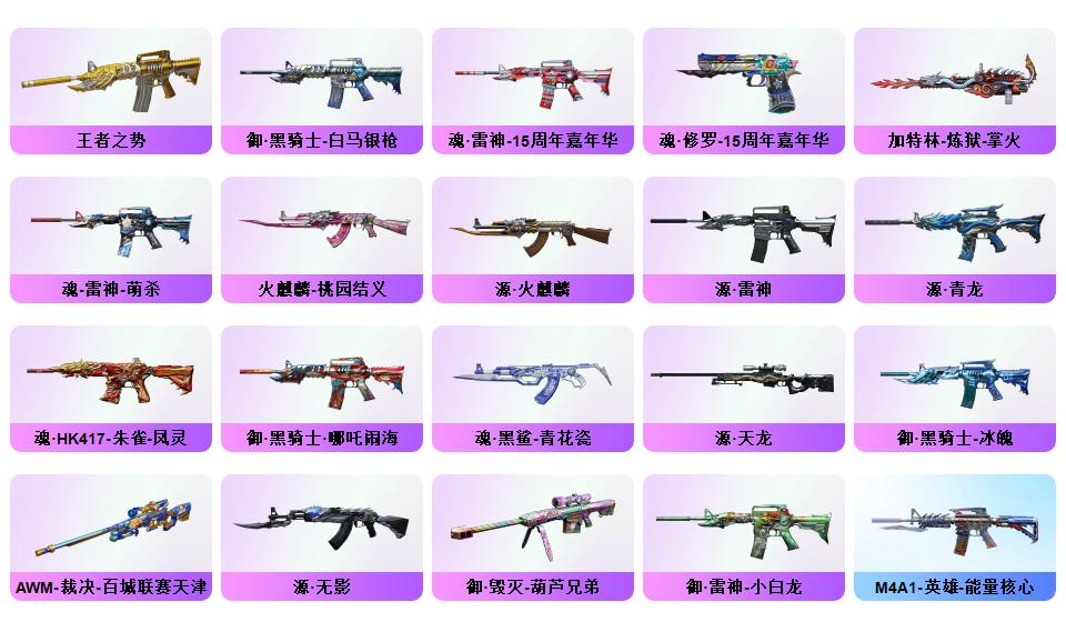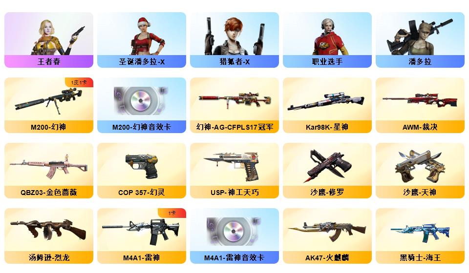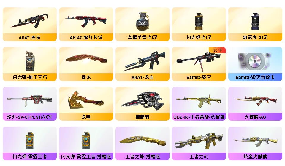 【幻神+幻神ag冠军+幻神音效卡】【usp神工天巧+cop幻灵】【星神】【王者春+职业选手】【觉醒qbz王者蔷薇】【qbz金色蔷薇】【火麒麟横秒之巅+毁灭sv冠军】【毁灭音效卡+雷神音效卡】雷神/火麒麟/黑鲨/毁灭/裁决【烈龙】【觉醒王者之锋】