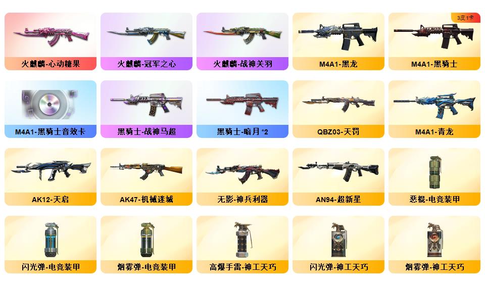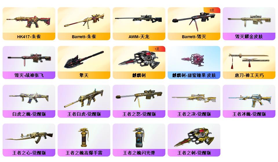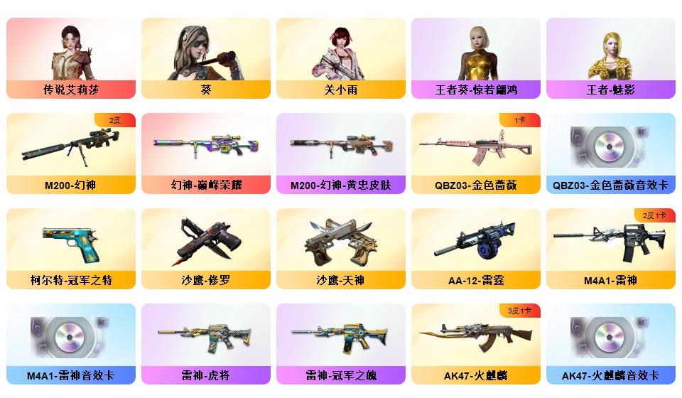 【传说艾莉莎】【幻神+幻神巅峰荣耀+幻神黄忠】【冠军之特】【关小雨+王者葵惊若翩鸿+王者沙漠玫瑰+王者魅影+王者零国色天香+灵动武士】【觉醒王者白虎+白虎之魄】【朱雀+青龙+朱雀大炮】【qbz金色蔷薇+金色蔷薇音效卡】【qbz天罚】【觉醒王者冰魄】【黑骑士白马银呛+毁灭张飞+火麒麟关羽+黑骑士马超+雷神赵云+雷神冠军之魄+火麒麟冠军之心】【火麒麟音效卡+黑骑士音效卡+雷神音效卡】【觉醒王者之心/怒/决/刺】【雷神呛娘蕾安