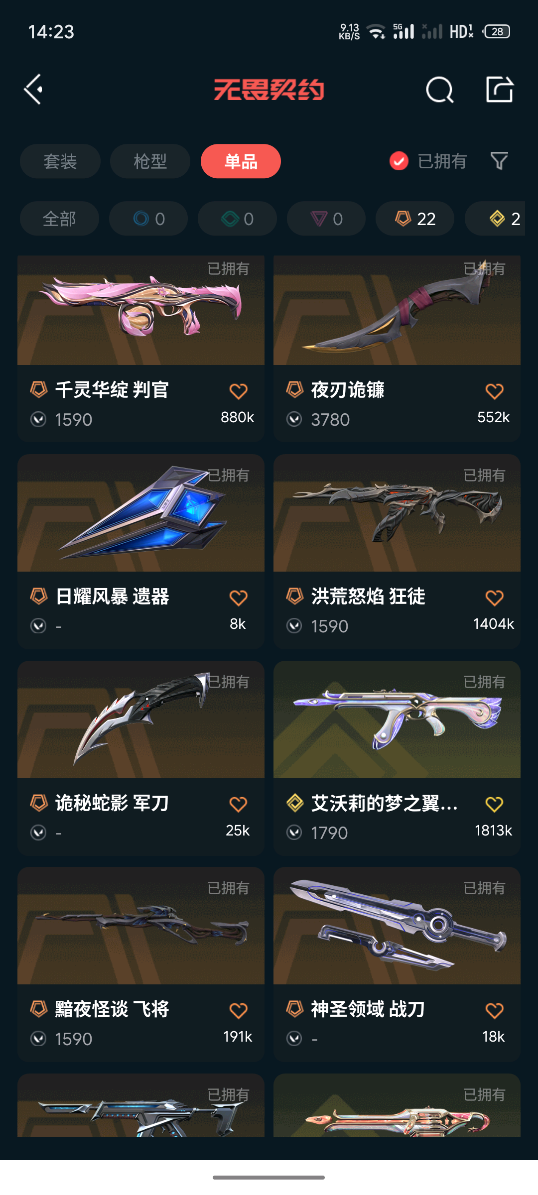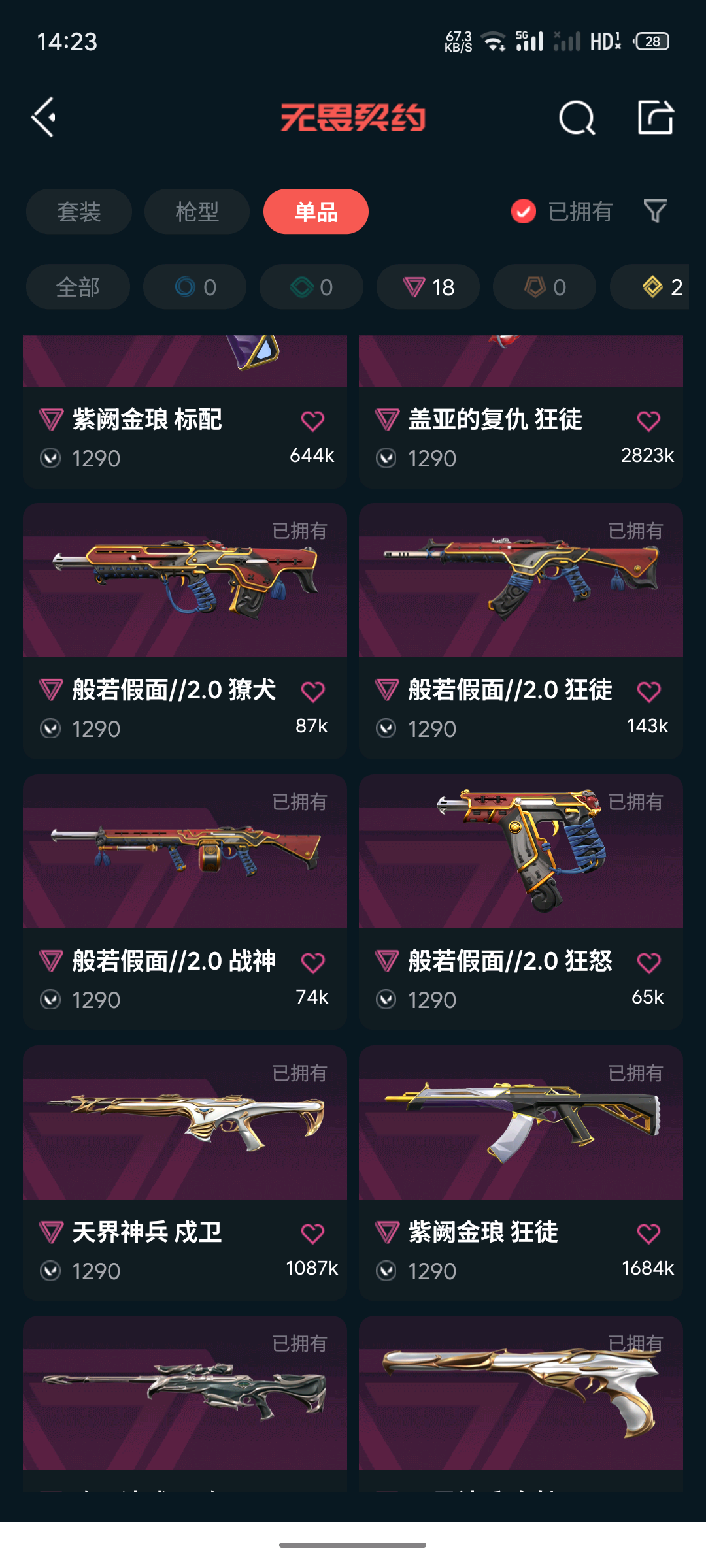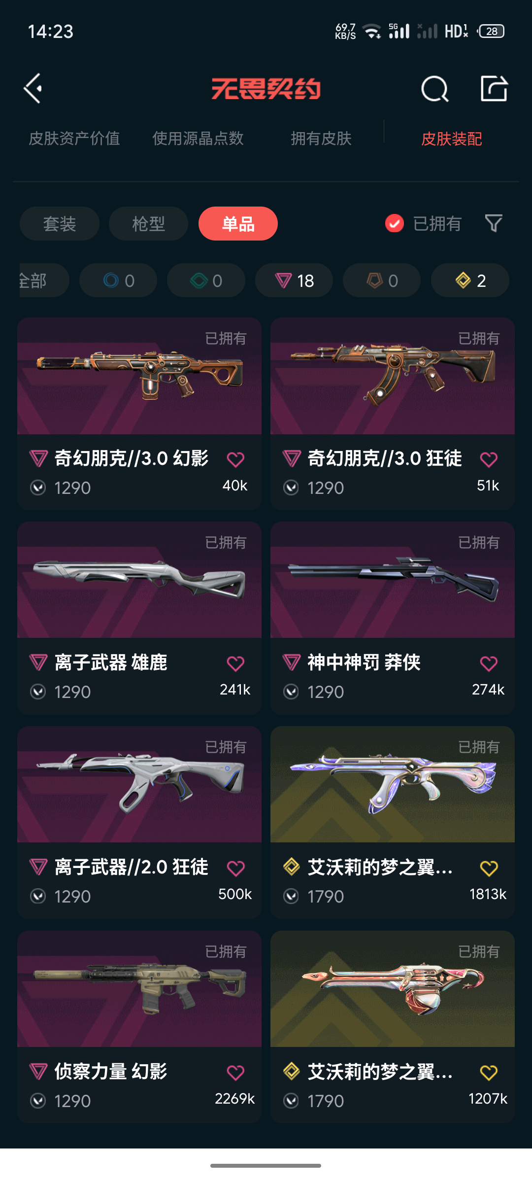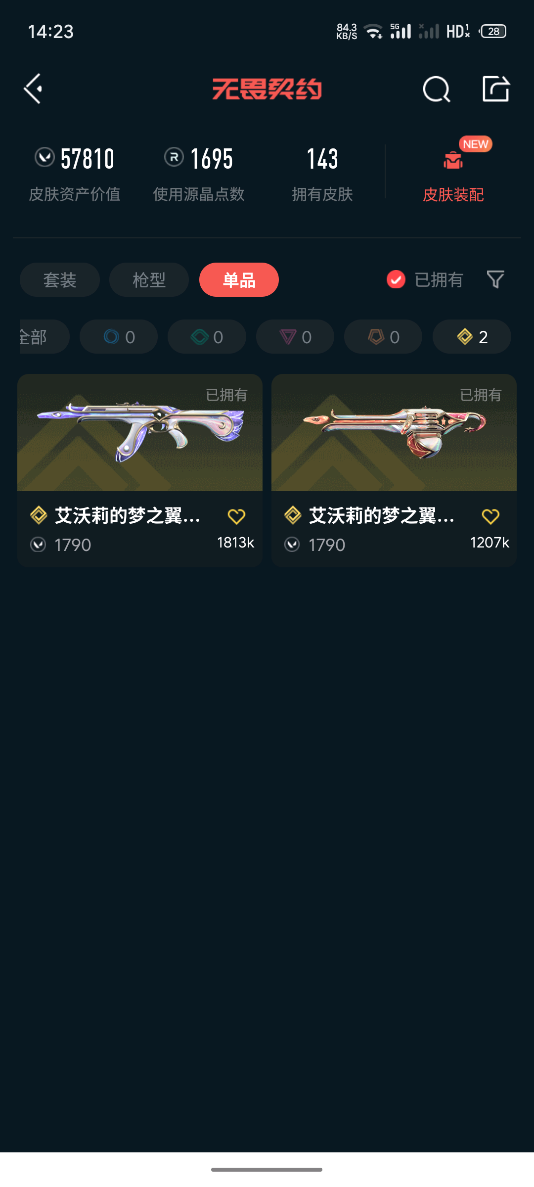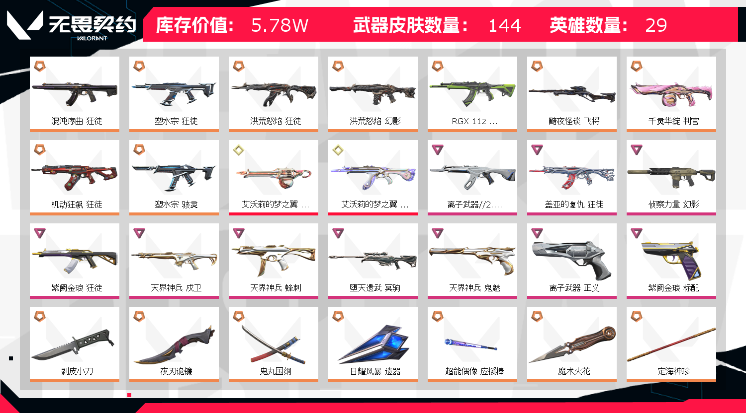 武器皮肤数量143;艾沃莉的梦之翼 奥丁,剥皮小刀,盖亚的复仇 狂徒,洪荒怒焰 狂徒,侦察力量 幻影,洪荒怒焰 幻影,紫阙金琅 狂徒,