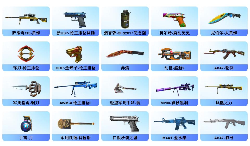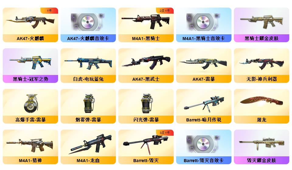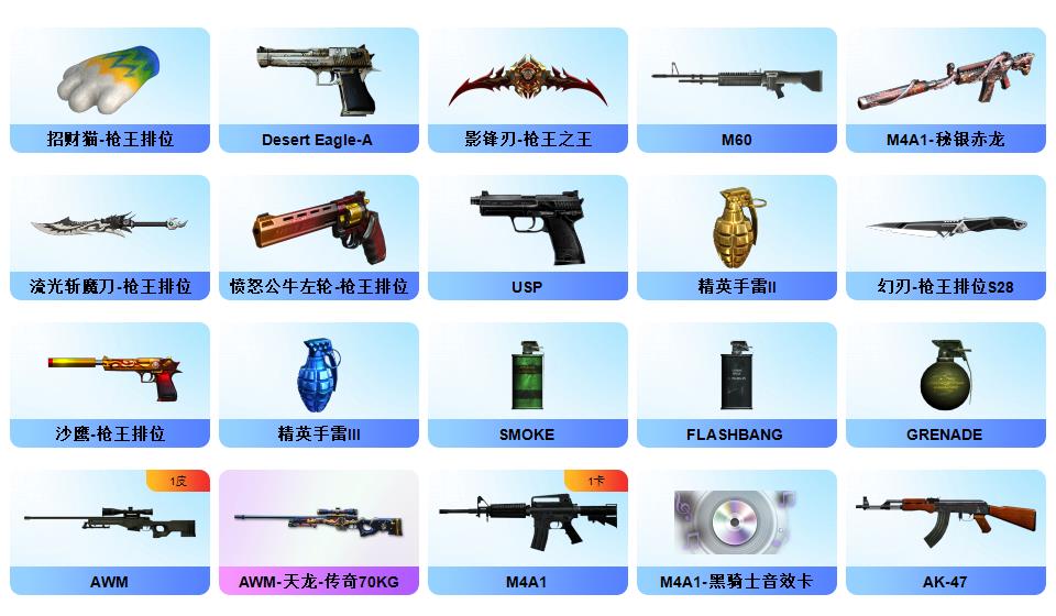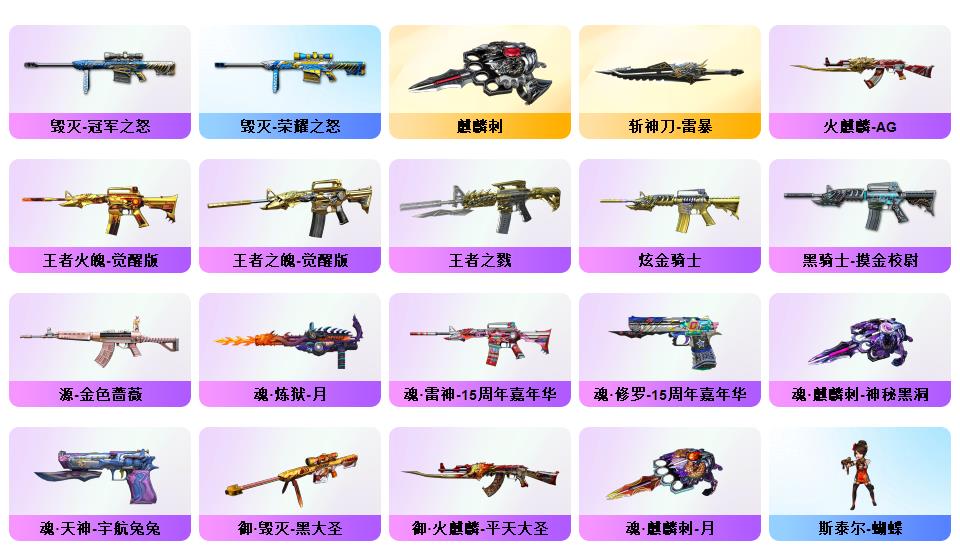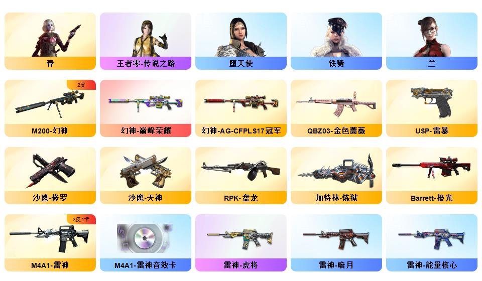 【幻神+幻神ag冠军+幻神巅峰荣耀】【2usp雷暴】【白虎电玩】【春+职业经理+乔伊教练+职业选手】【雷暴套】【qbz金色蔷薇】【觉醒王者火魄】【火麒麟横秒之巅+黑骑士冠军之势+毁灭冠军之怒+毁灭荣耀之怒】【毁灭音效卡+火麒麟音效卡+雷神音效卡+黑骑士音效卡】【觉醒王者之魄】【炼狱+斯泰尔蝴蝶】【金刚伞】【猫猫手套+手斧镜】【炫彩背包】