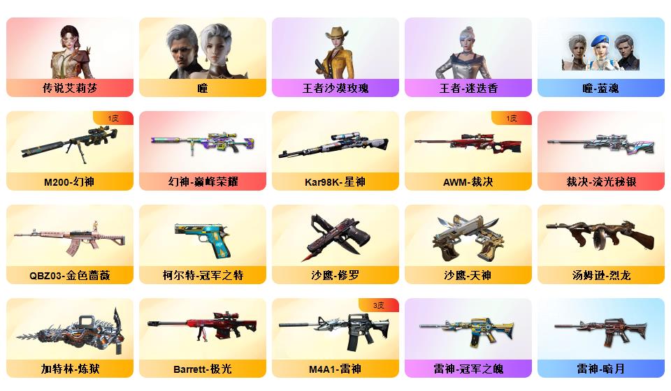 【传说艾莉莎】【幻神+幻神巅峰荣耀】【冠军之特】【冠军之刃】【星神】【白虎之魄】【王者沙漠玫瑰+王者迷迭香+乔伊教练满套装+女主播+职业选手/白鲨语音包/绝迹语音包】【qbz金色蔷薇+qbz冠军之薇】【觉醒王者之武/怒/光/啸】【裁决流光秘银+黑龙冠军之武+黑骑士冠军之势+毁灭荣耀之怒+屠龙荣耀之锋+雷神冠军之魄】【黑骑士音效卡+烈火动感闪耀音效卡+天神动感闪耀音效卡】