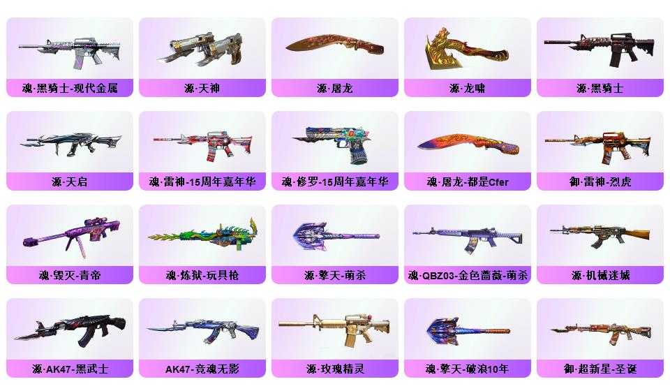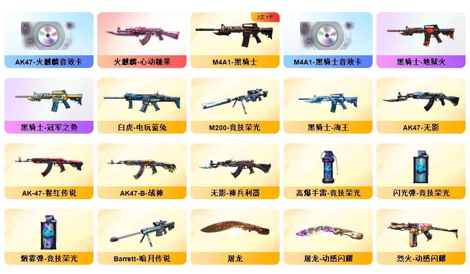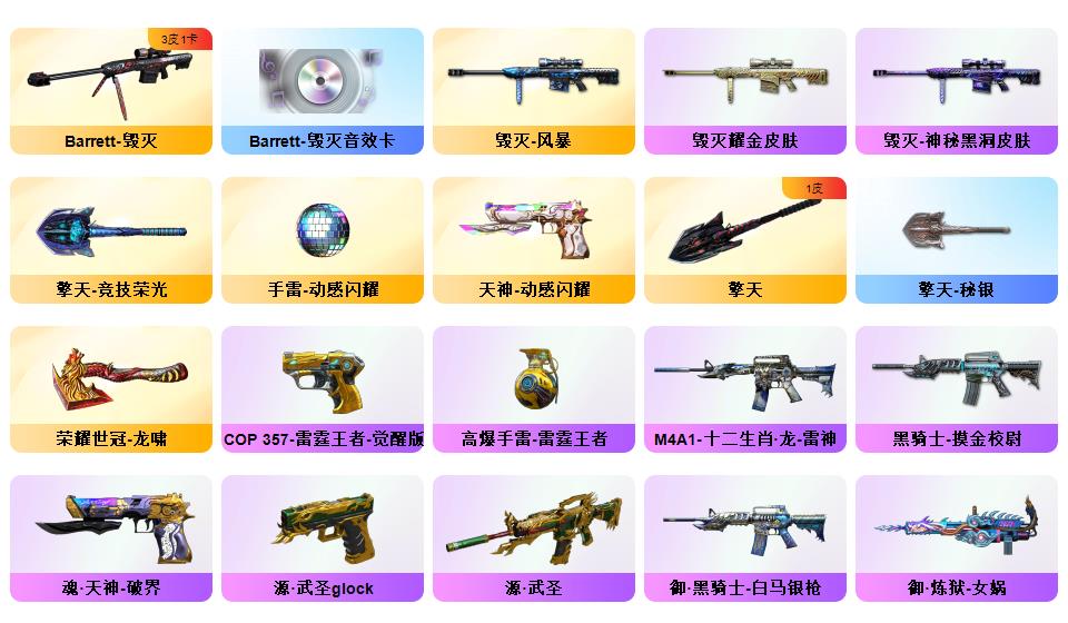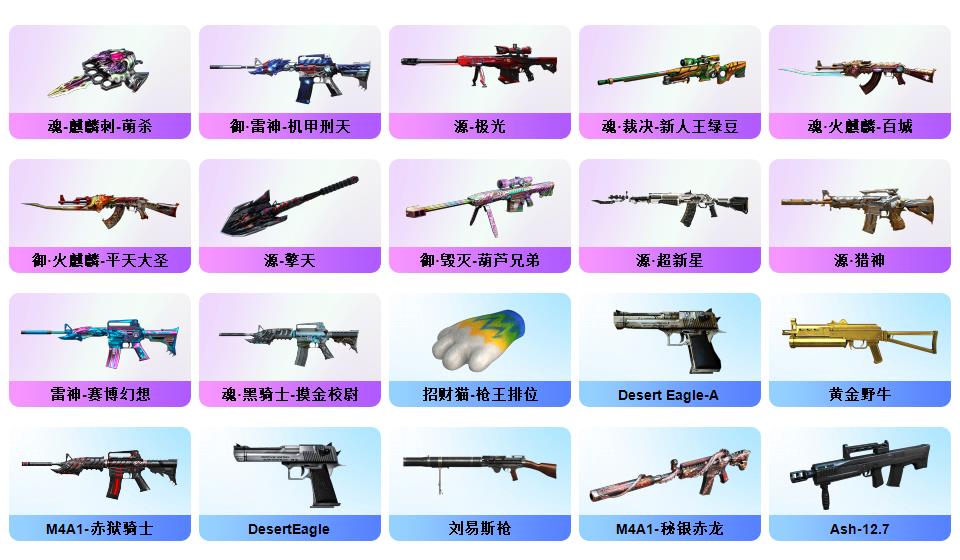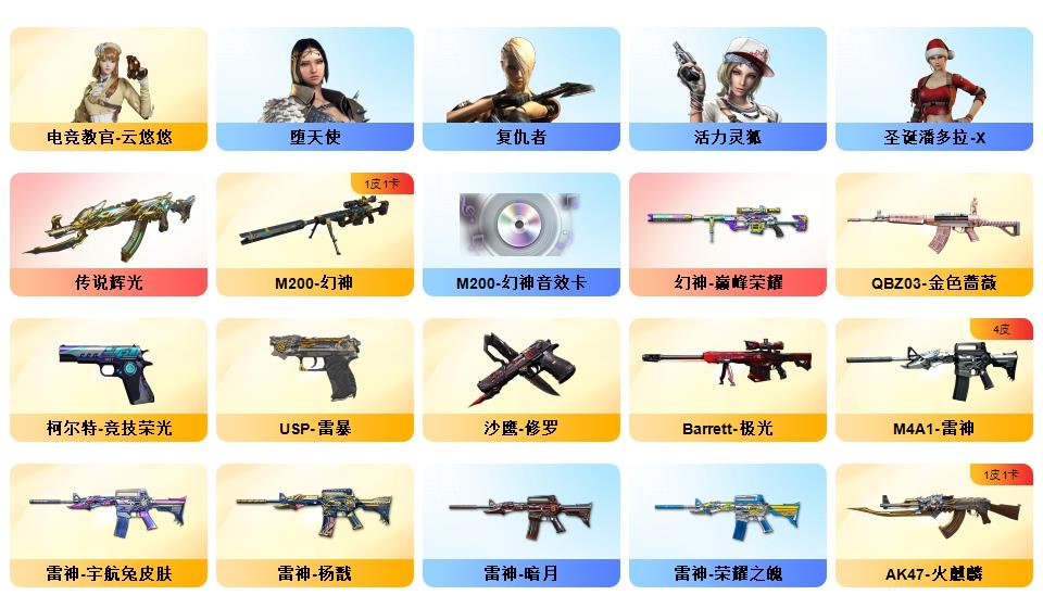 【幻神+幻神巅峰荣耀+幻神音效卡】【竞技柯尔特+usp雷暴+cop雷霆王者】【传说辉光】【竞技荣光套+云悠悠】【零热舞青春+乔伊教练满套装+樱青春偶像】【白虎电玩】【qbz金色蔷薇】【火麒麟呛娘凯萨琳+黑骑士冠军之势+毁灭风暴+雷神杨戬+无影霓裳+雷神荣耀之魄】【火麒麟音效卡+毁灭音效卡+黑骑士音效卡】【荣耀世冠龙啸】【超级背包+虎牙炫彩背包】【工具钳手雷包】