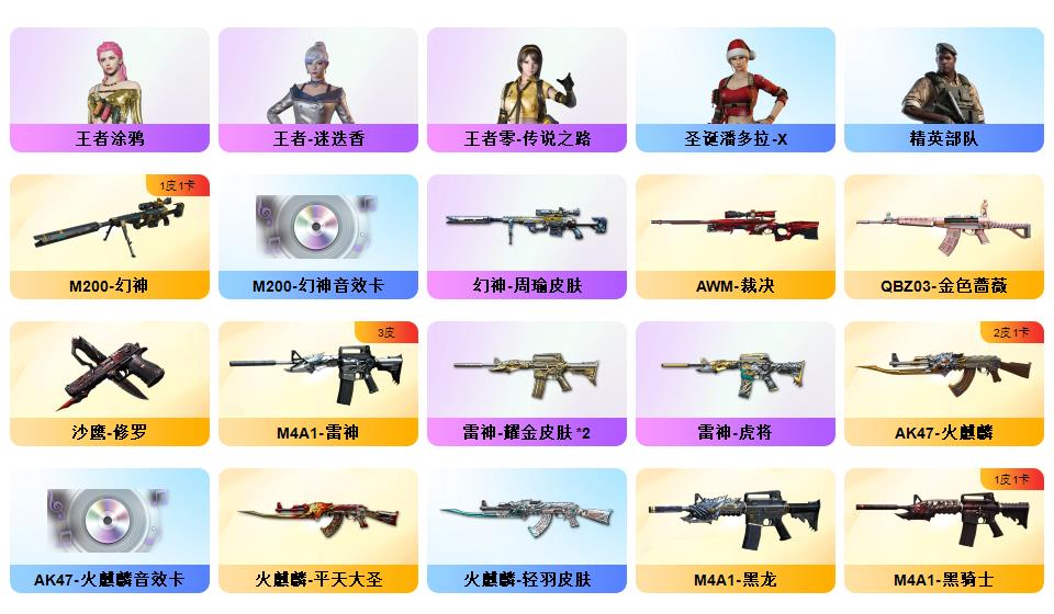 【幻神+幻神周瑜+幻神音效卡】【传说圣灵】【觉醒王者幻神】【青龙】【qbz金色蔷薇】【觉醒qbz王者蔷薇】【王者涂鸦+王者迷迭香+职业选手】【火麒麟横秒之巅+火麒麟轻羽+毁灭sv冠军】【毁灭音效卡+火麒麟音效卡+黑骑士音效卡】【觉醒王者之武/魄】【2炼狱】【王者冰魄】【金刚伞】【cop旗袍】1911大黄蜂+手斧镜【超级背包】【工具钳手雷包】