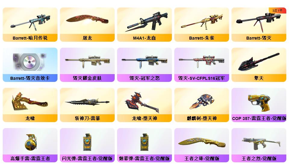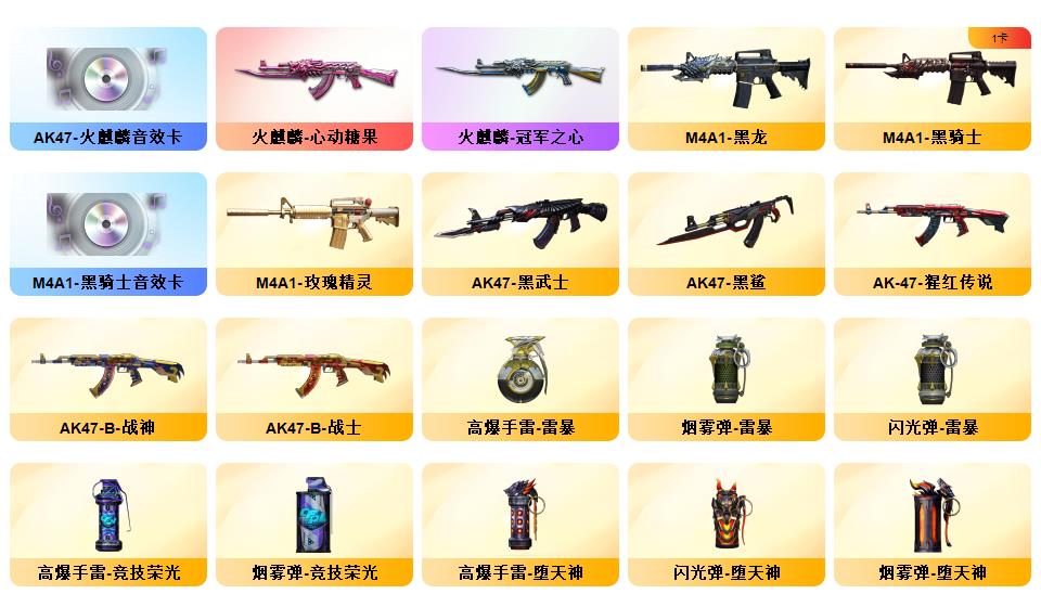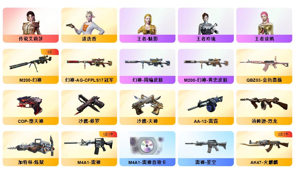 【幻神+幻神ag冠军+幻神周瑜+幻神黄忠】【王者之烈 qbz金色蔷薇】【白虎暗星 毁灭sv冠军 毁灭冠军之怒 火麒麟冠军之心 雷神白鲨】【火麒麟 雷神 毁灭 黑骑士音效卡】【火麒麟 雷神 毁灭】2cop【芭蕾特零水下丽影】【王者春 王者魅影 王者凌霄 王者涂鸦】ac+工具包+手雷包